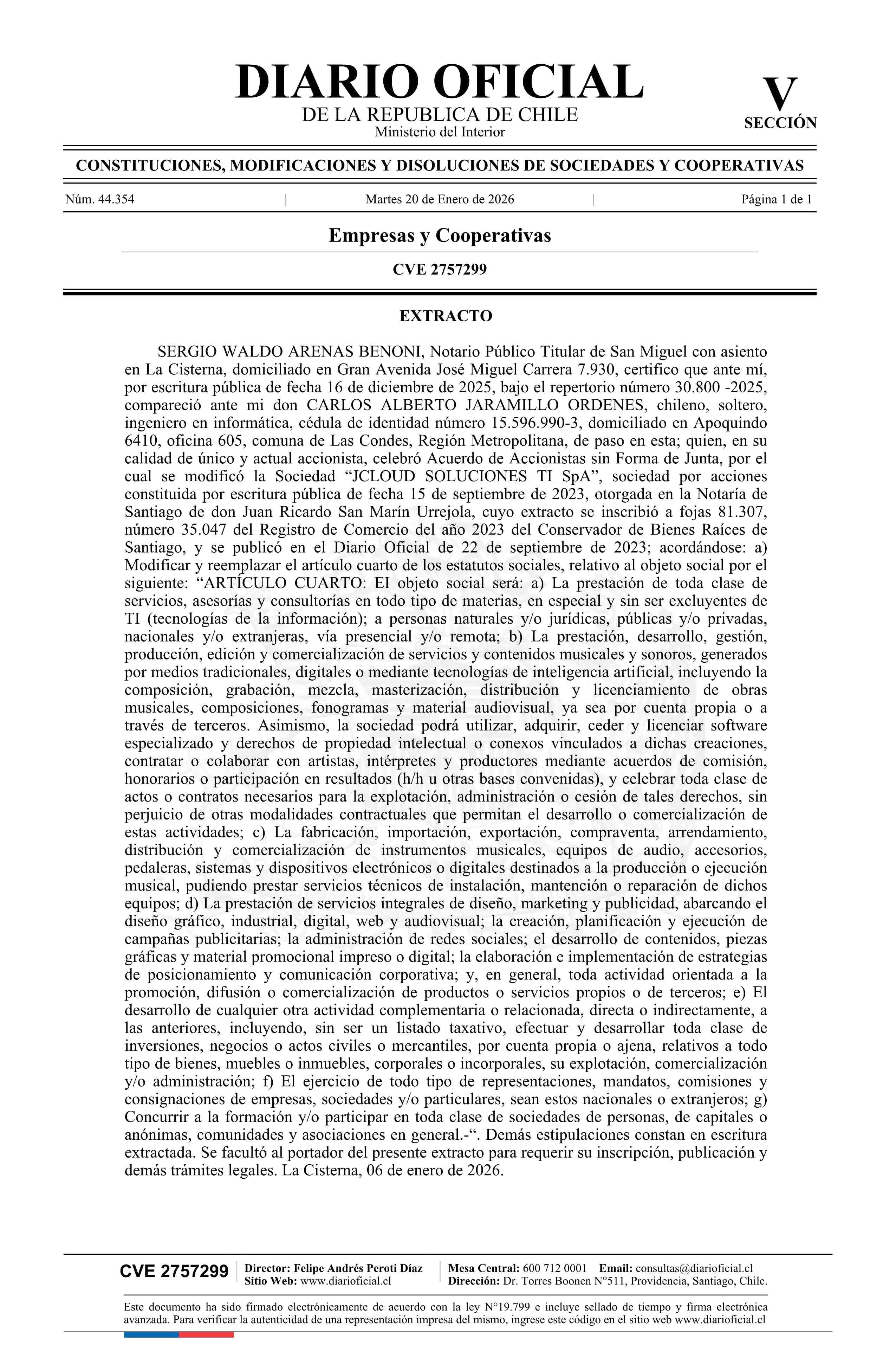 JCLOUD SOLUCIONES TI SpA 76.699.603-5* 20-01-2026 Diario Oficial Edición Electrónica |