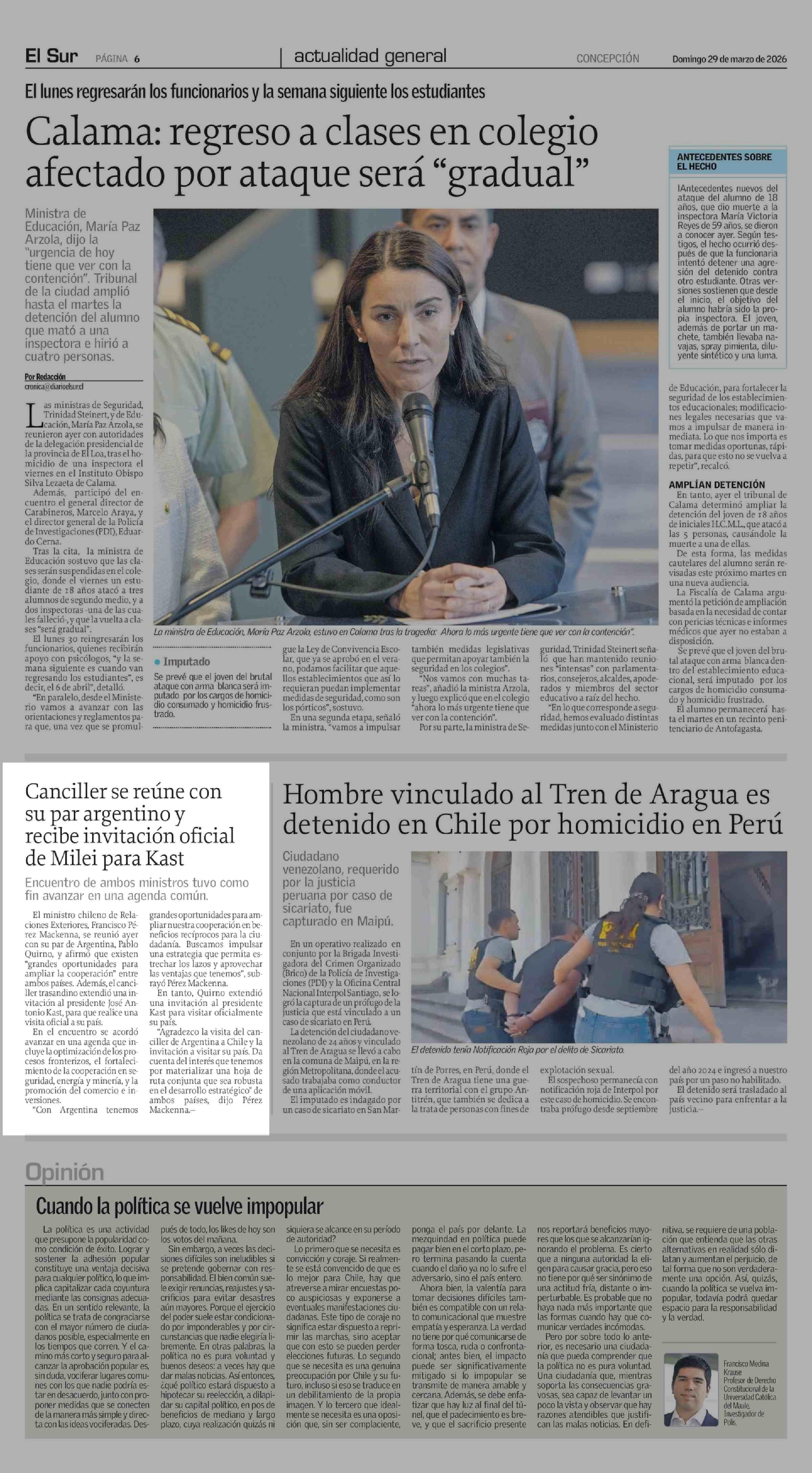 Canciller se reúne con su par argentino y recibe invitación oficial de Milei para Kast 29-03-2026 El Sur |