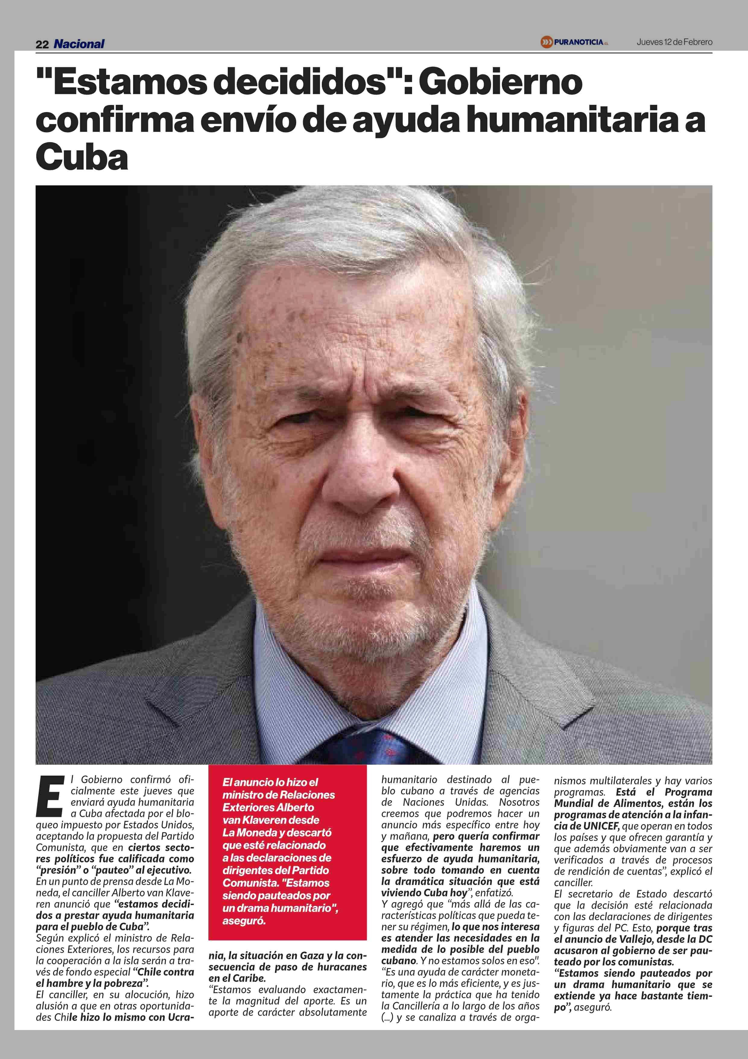 “Estamos decididos”: Gobierno• confirma envio de ayuda humanitaria a Cuba 12-02-2026 Puranoticia.cl |