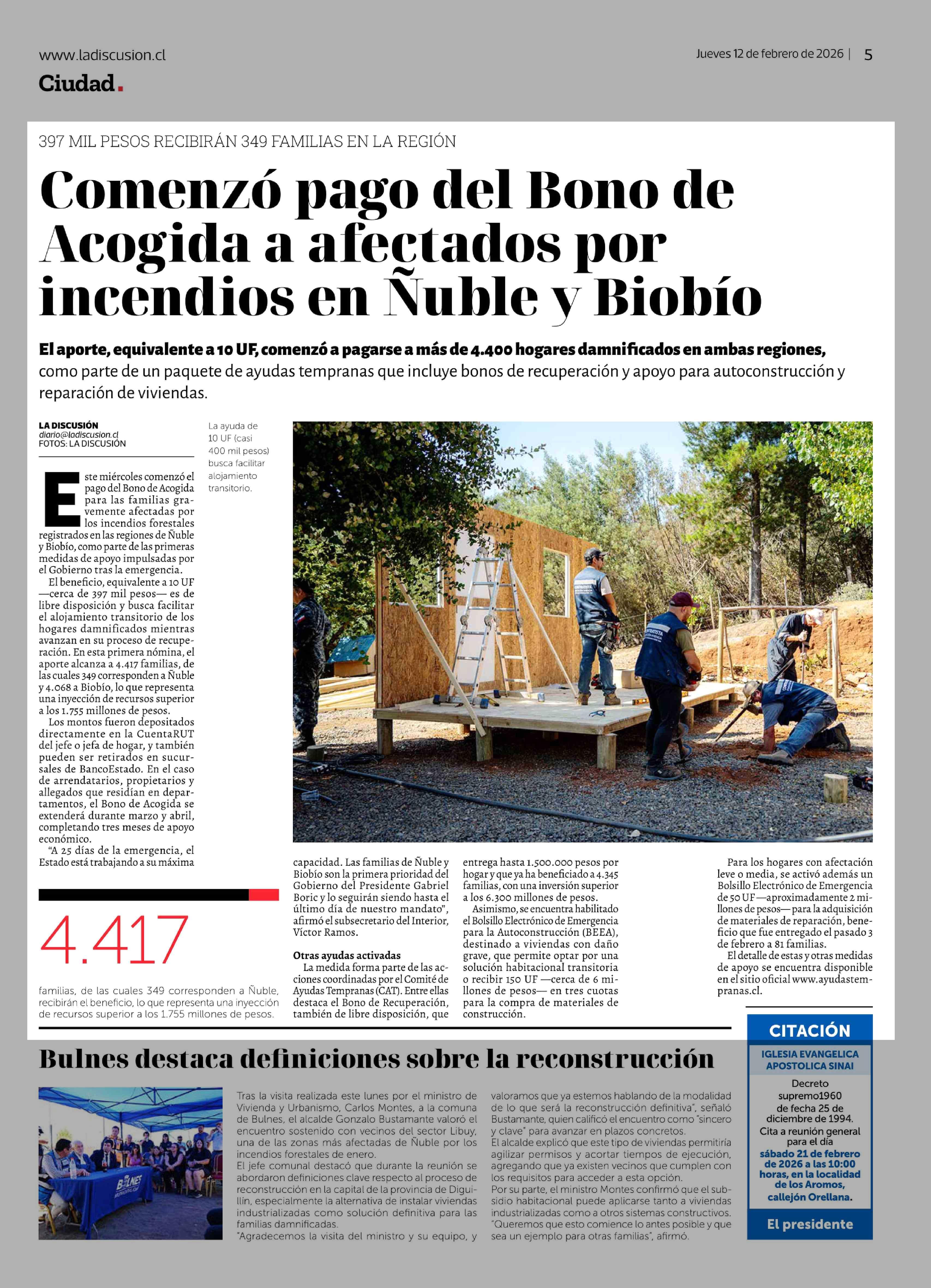 Comenzó pago del Bono de Acogida a afectados por incendios en Nuble y Biobio 12-02-2026 La Discusión |