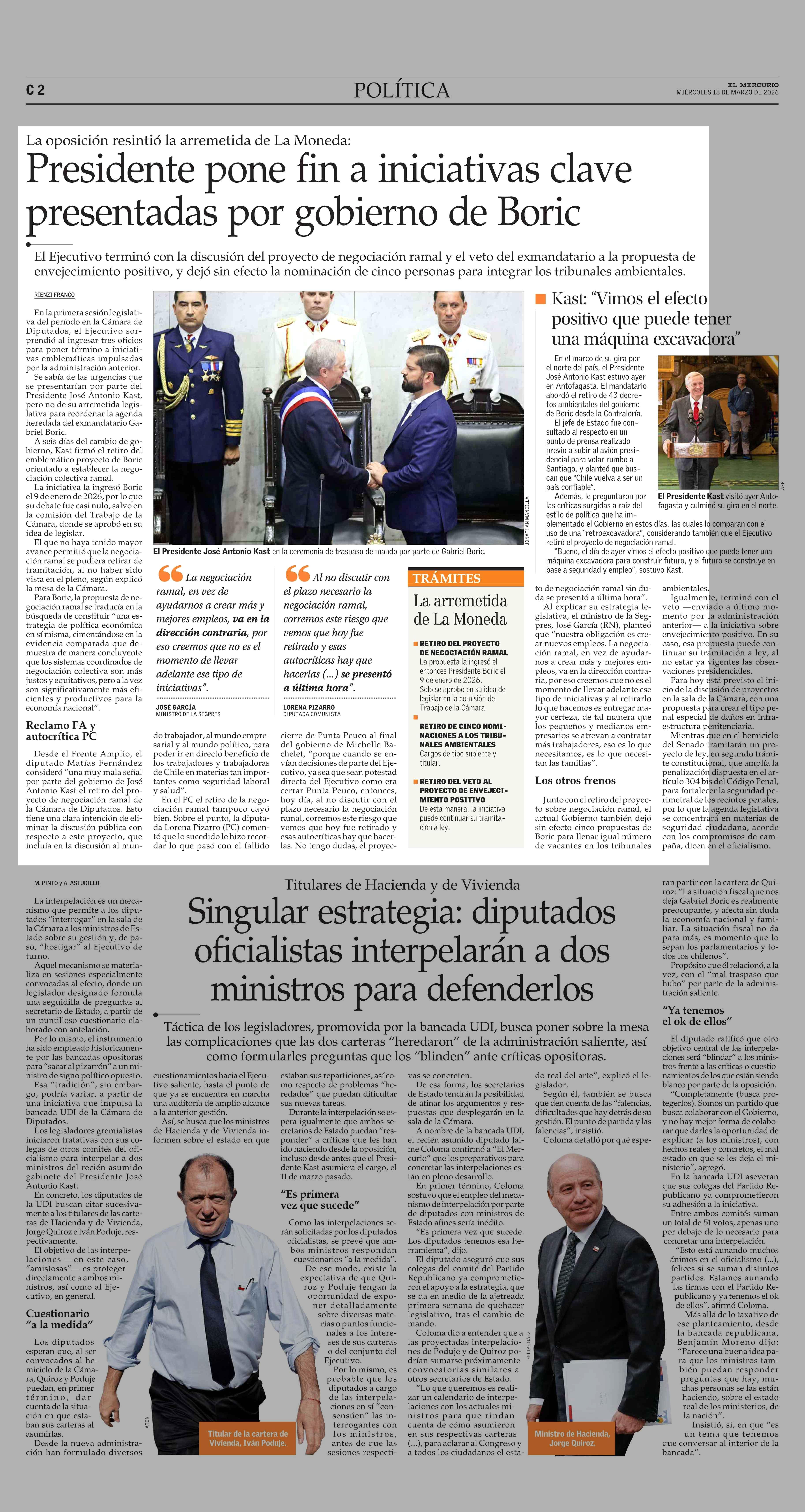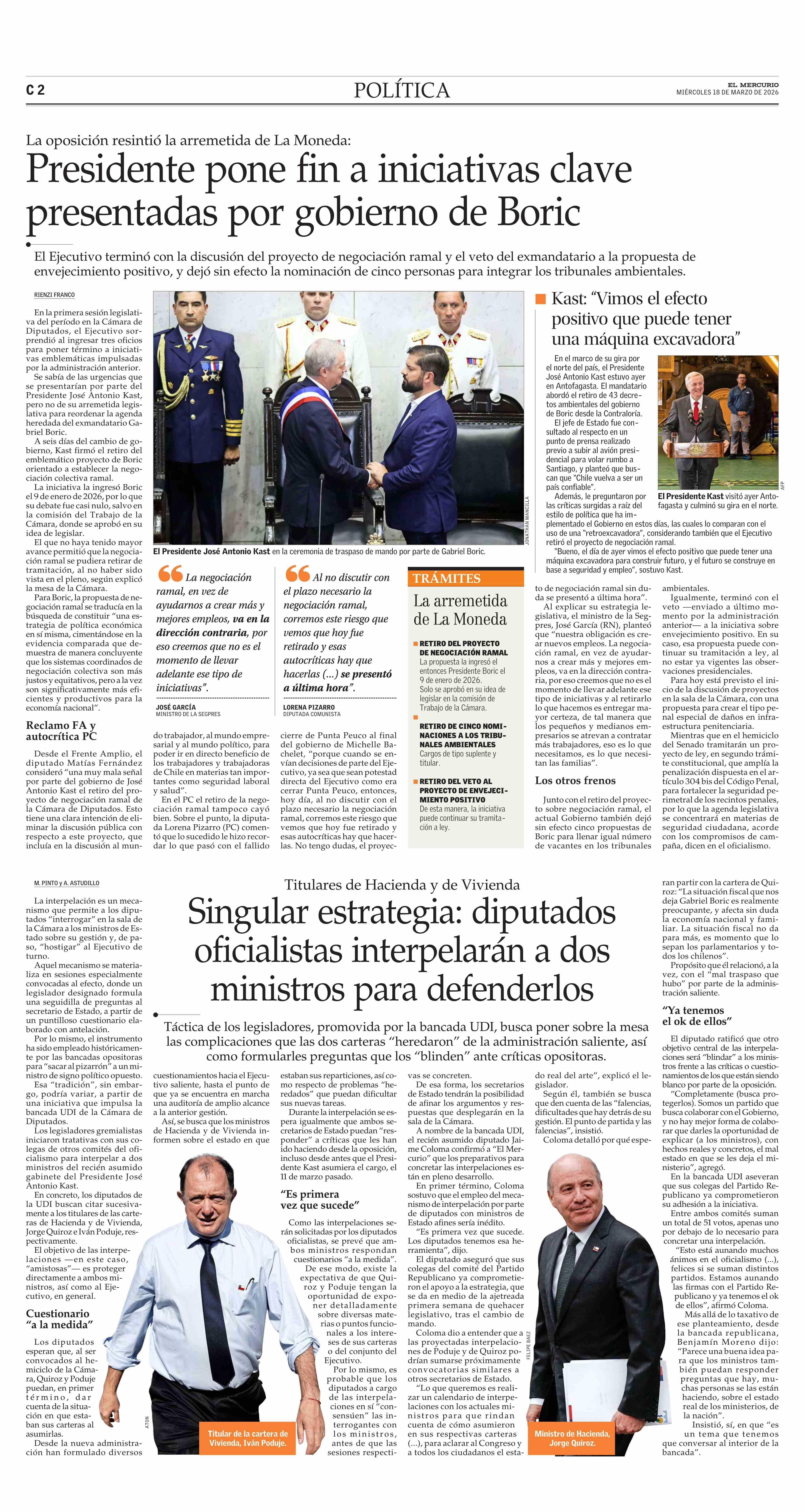 Presidente pone fin a iniciativas clave presentadas por gobierno de Boric 18-03-2026 El Mercurio |