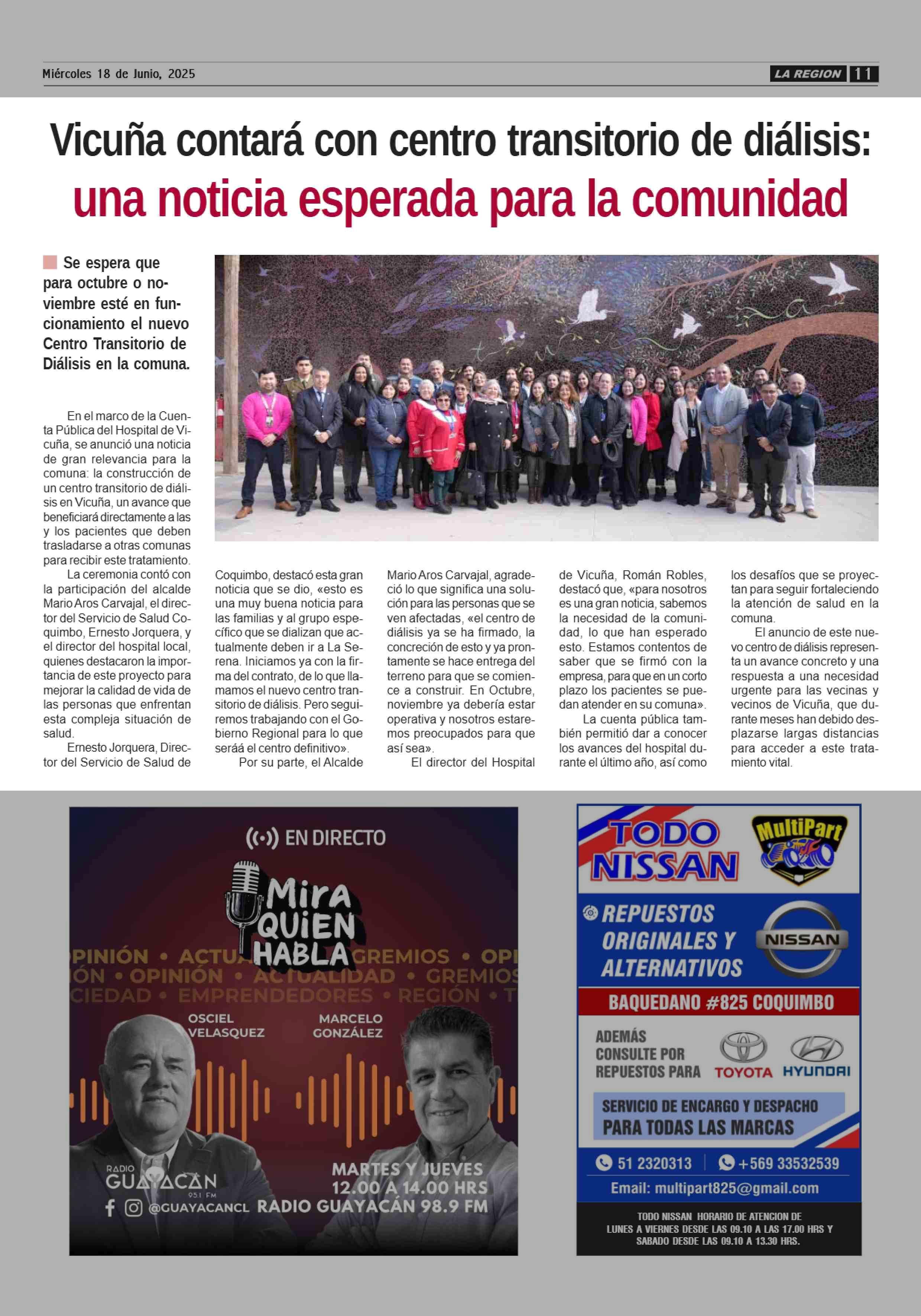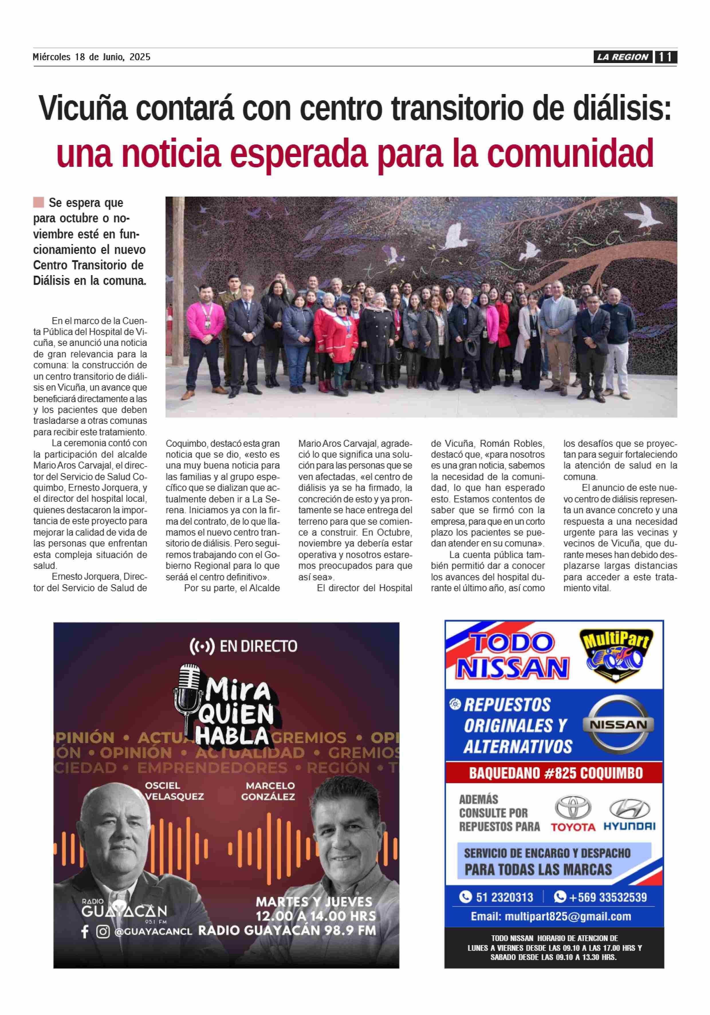 Vicuña contará con centro transitorio de diálisis: una noticia esperada para la comunidad 18-06-2025 Diario la Región |