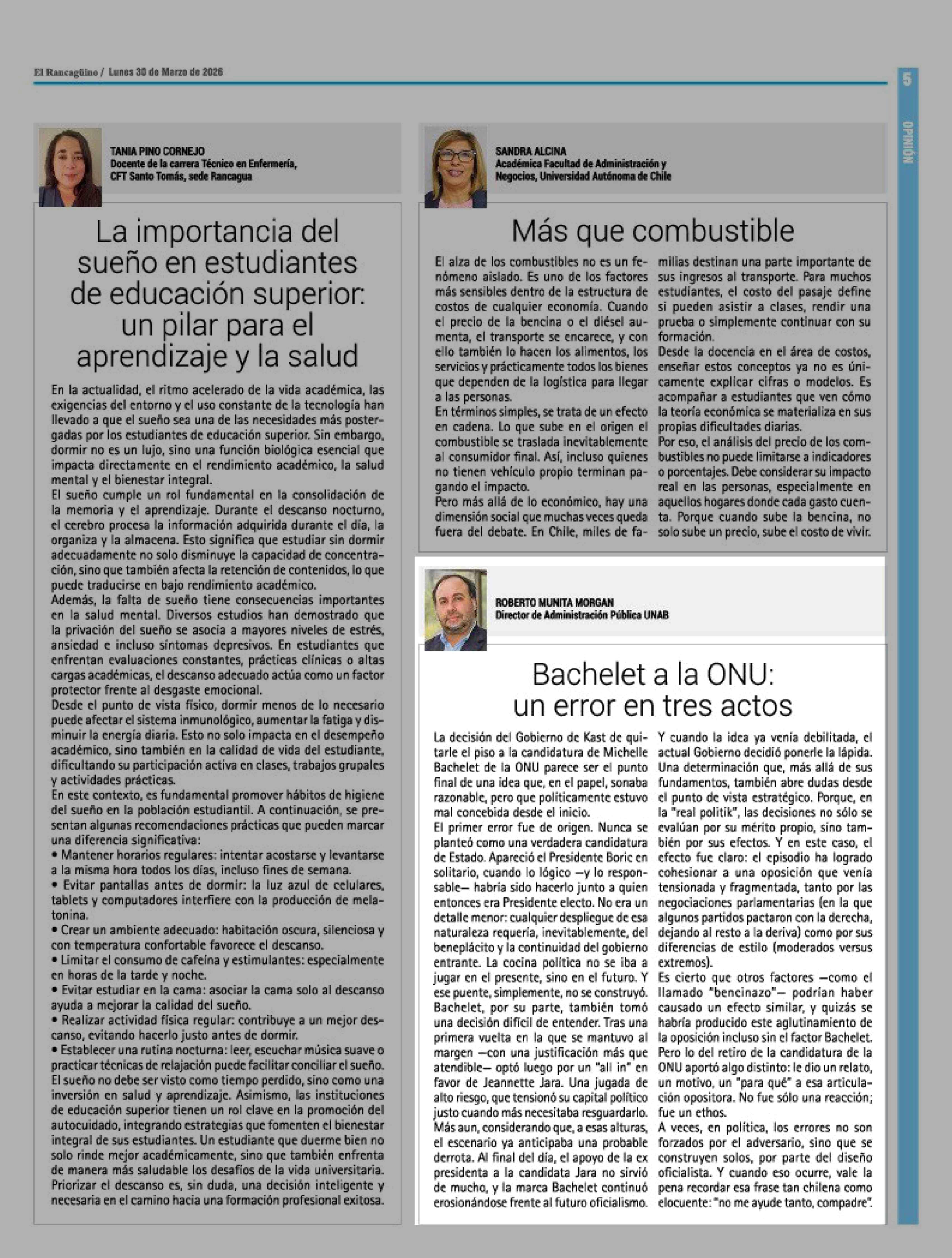 Columnas de Opinión: Bachelet a la ONU: un error en tres actos 30-03-2026 El Rancagüino |