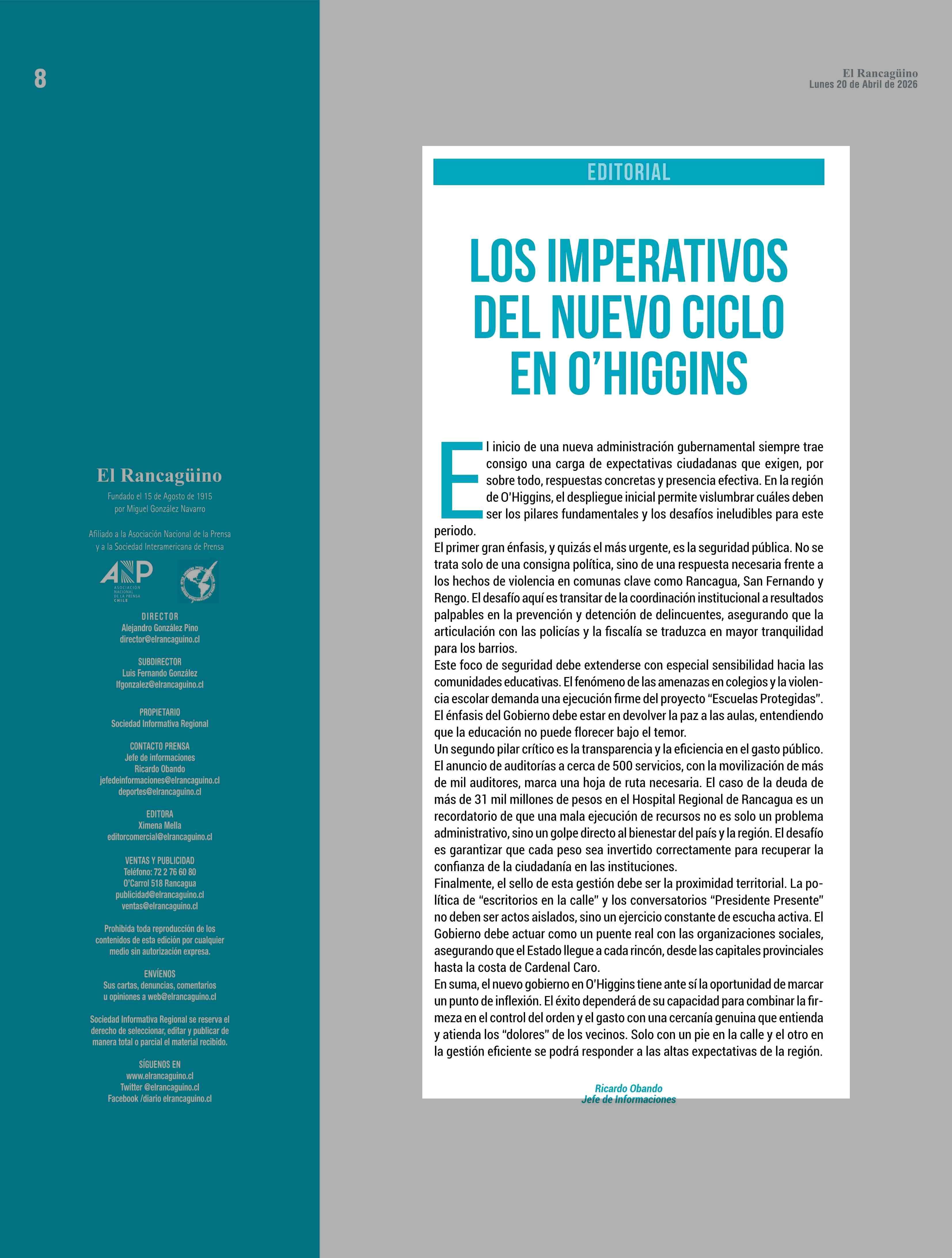 LOS IMPERATIVOS DEL NUEVO CICLO EN 0'HIGGINS 20-04-2026 El Rancagüino |