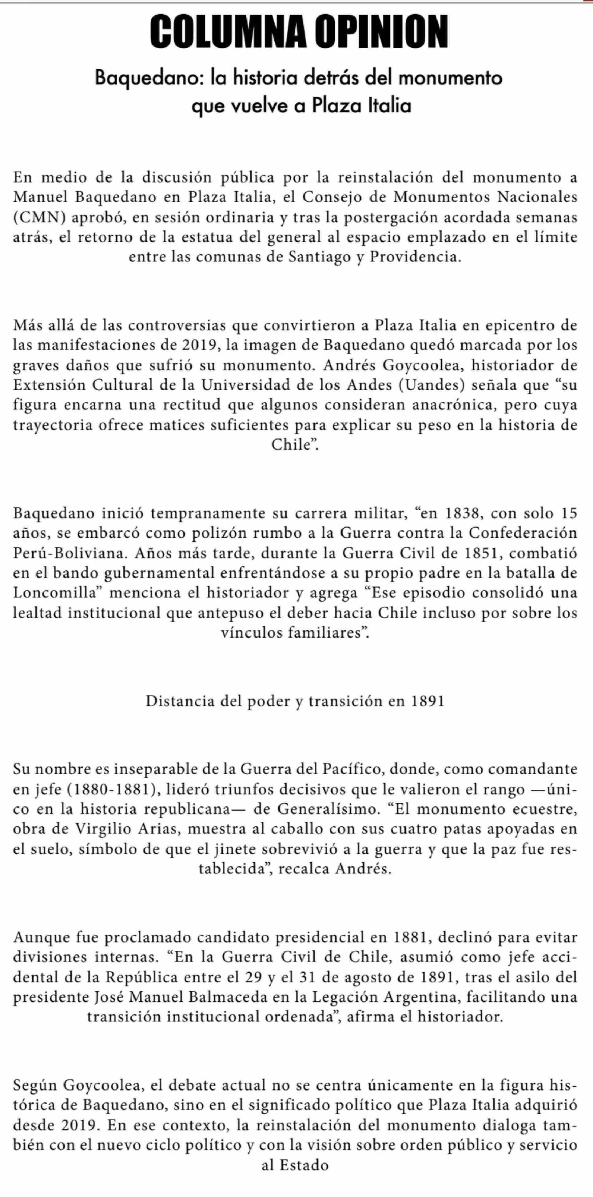 | Título: | Columnas de Opinión: En medio de la discusión pública por la reinstalación del monumento a Manuel Baquedano en Plaza Italia, el Consejo de Monumentos Nacionales (CMN) aprobó, en sesión ordinaria y tras la postergación acordada semanas atrás, el retorno de la estatua del general al espacio emplazado |