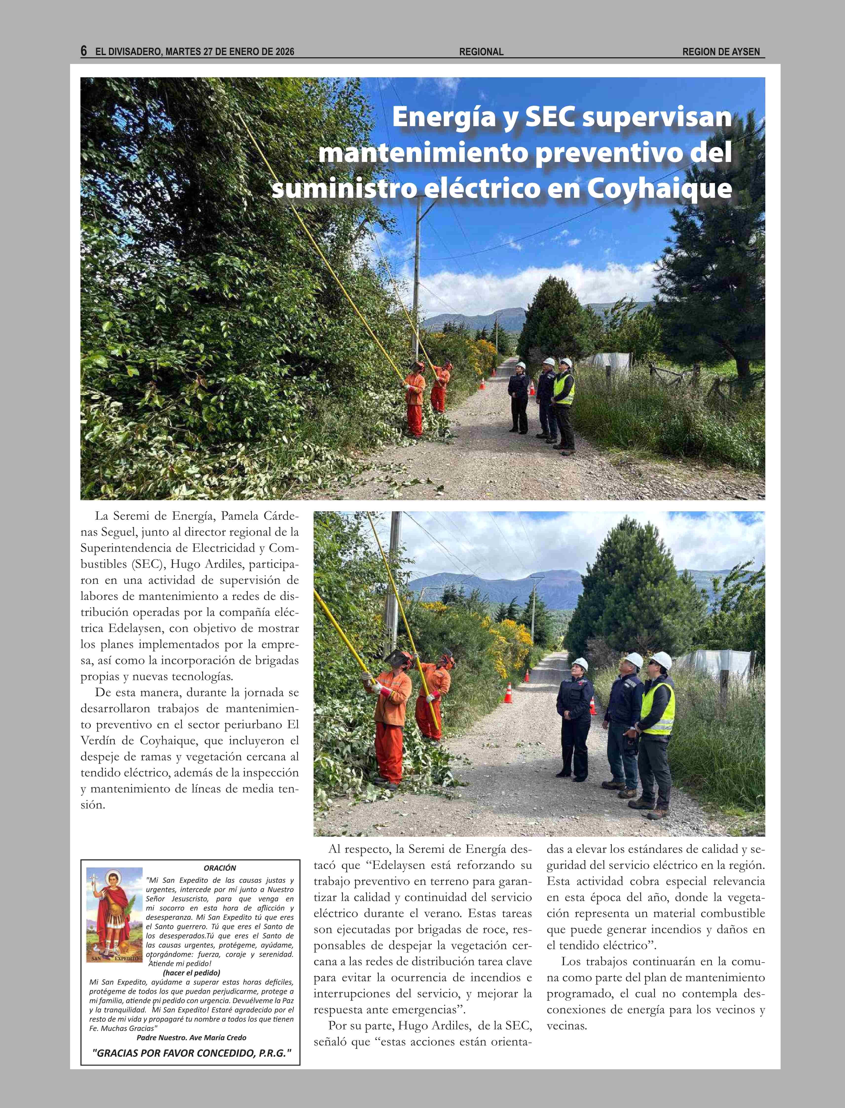 Energía y SEC supervisan mantenimiento preventivo del suministro eléctrico en Coyhaique 27-01-2026 El Divisadero |