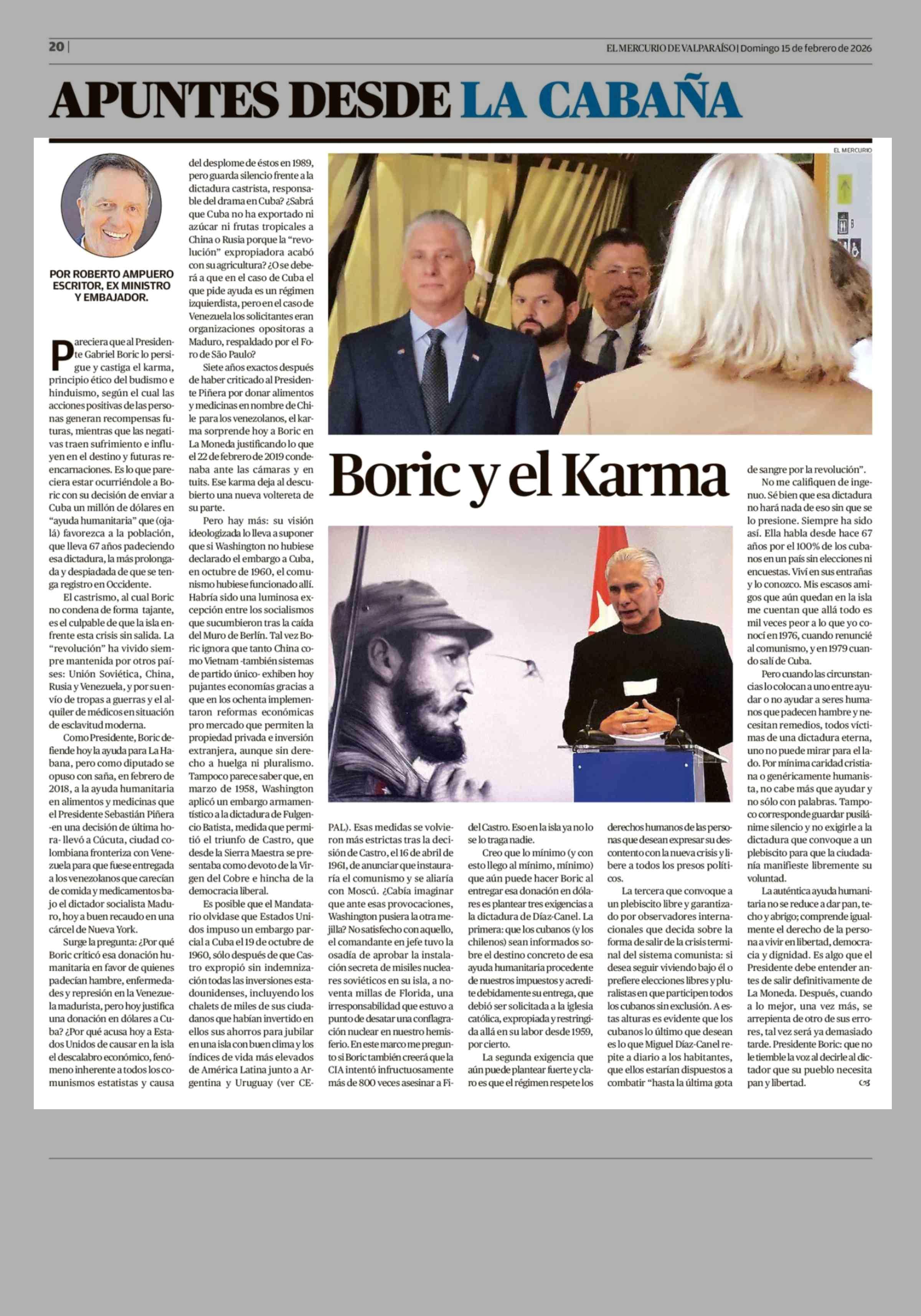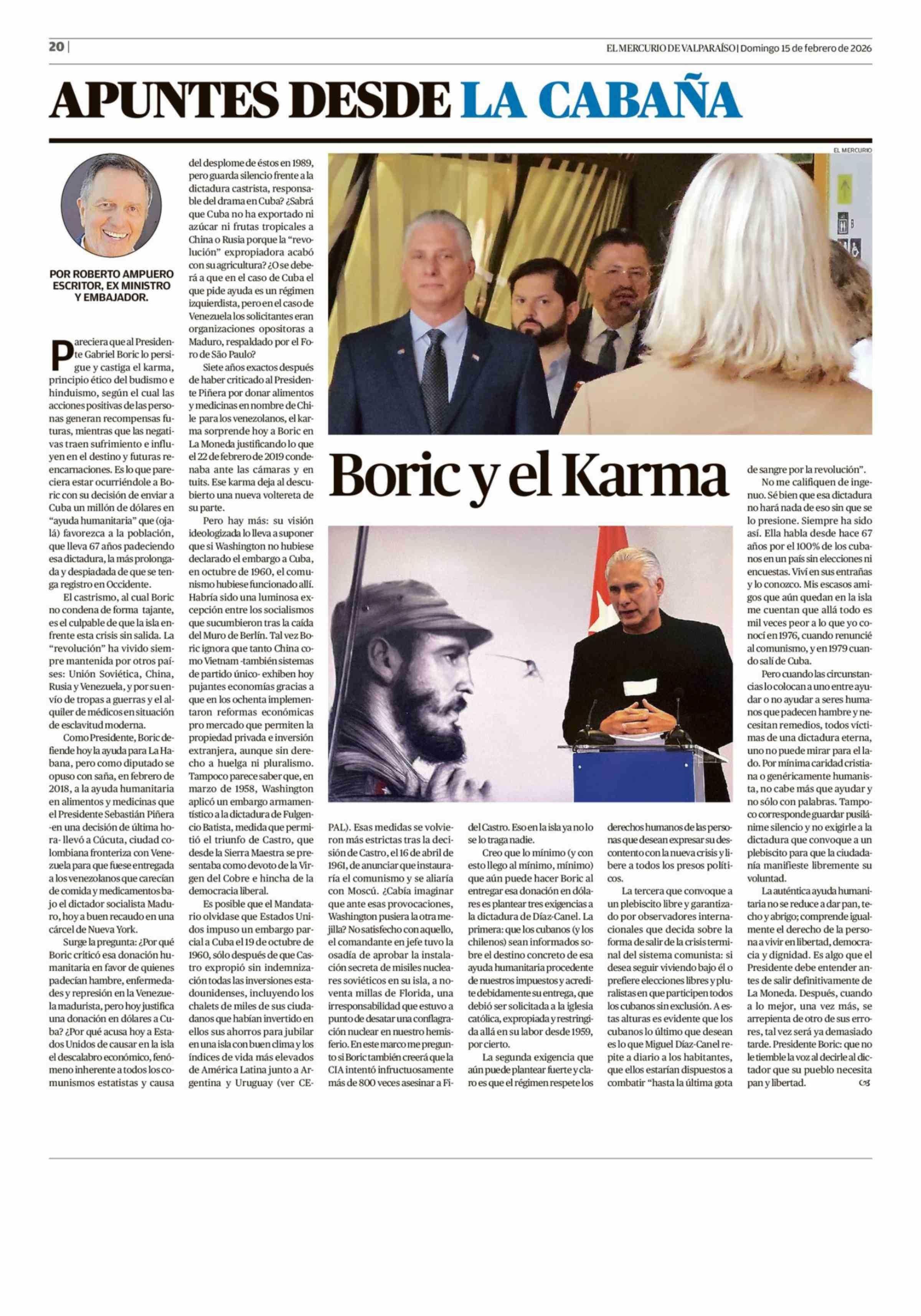 Columnas de Opinión: Boric y el Karma 15-02-2026 El Mercurio de Valparaíso |