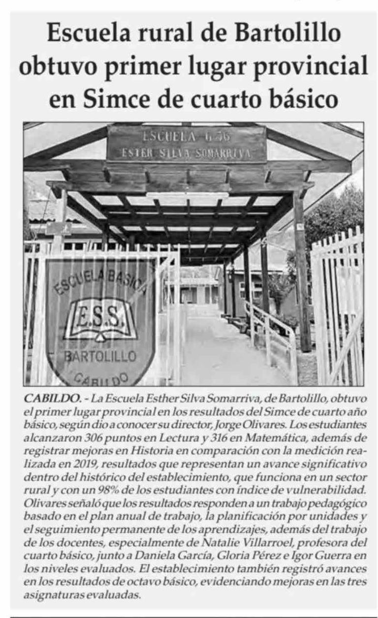 | Título: | Escuela rural de Bartolillo obtuvo primer lugar provincial en Simce de cuarto básico |
