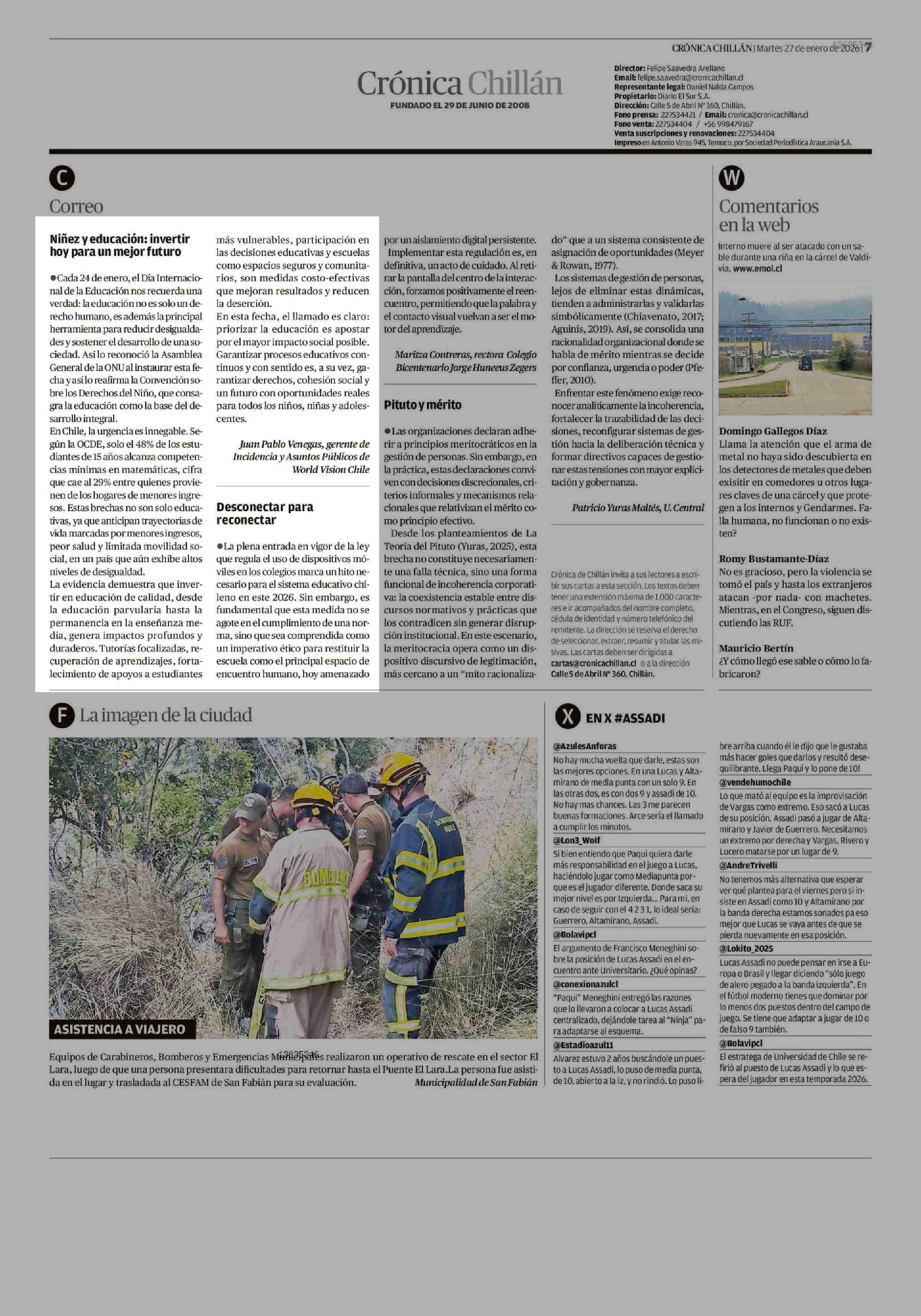 Cartas: Niñez y educación: invertir hoy para un mejor futuro 27-01-2026 Crónica de Chillán |