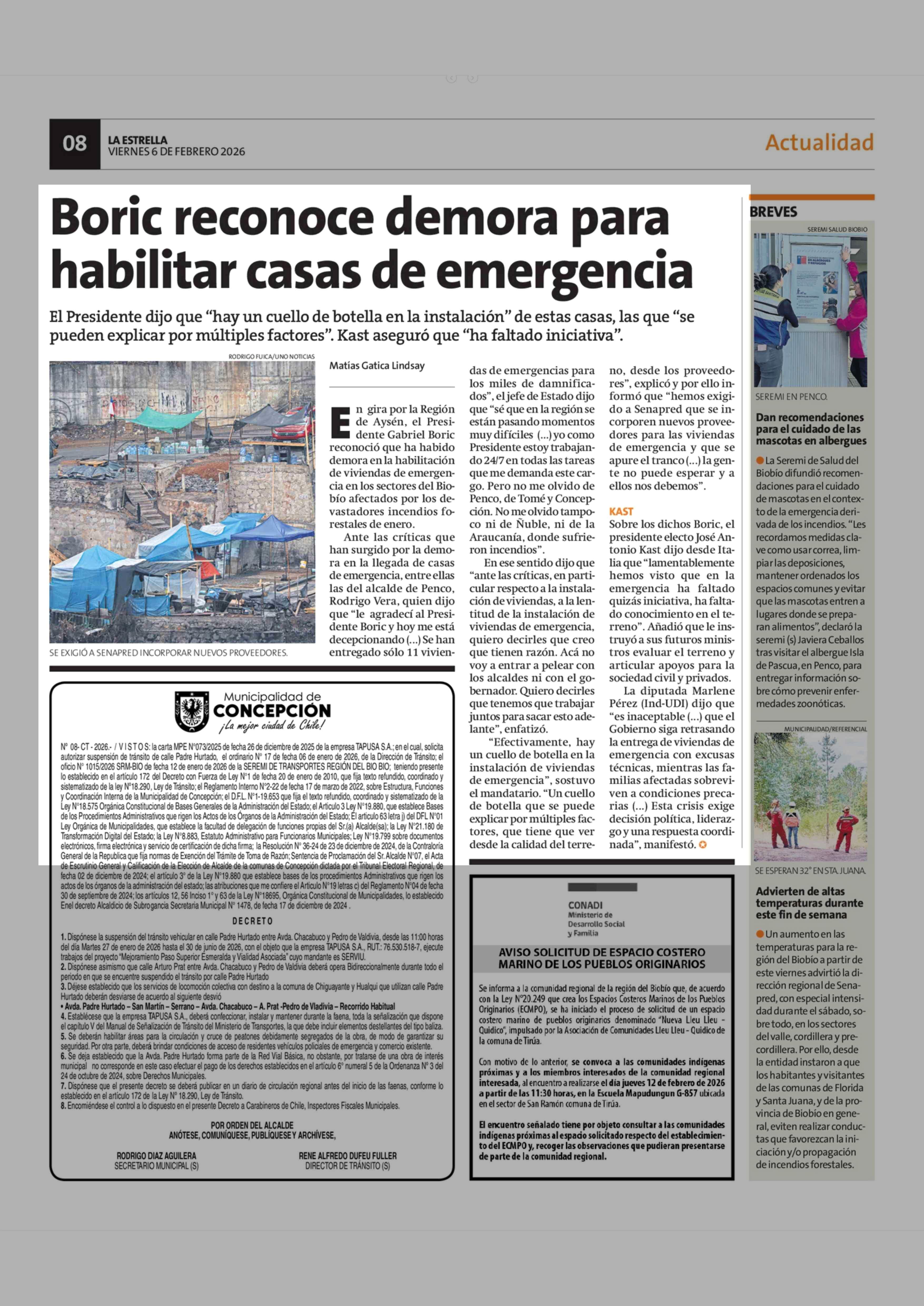 Boric reconoce demora para habilitar casas de emergencia 06-02-2026 La Estrella de Concepción |