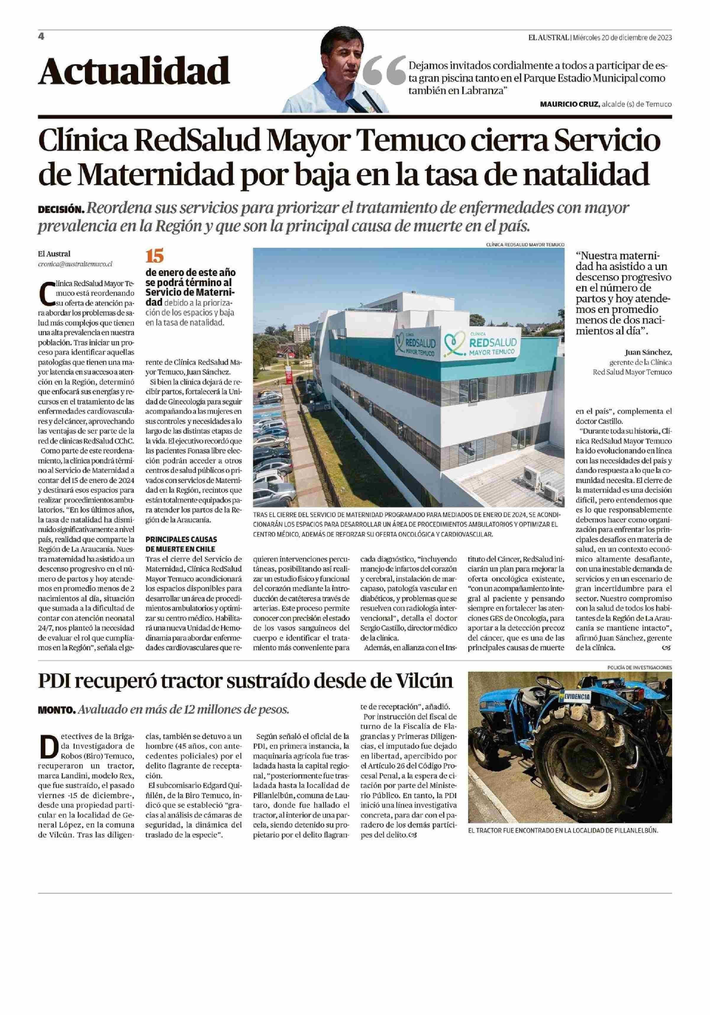 Clínica RedSalud Mayor Temuco cierra Servicio de Maternidad por baja en la tasa de natalidad 20-12-2023 El Austral de la Araucanía |