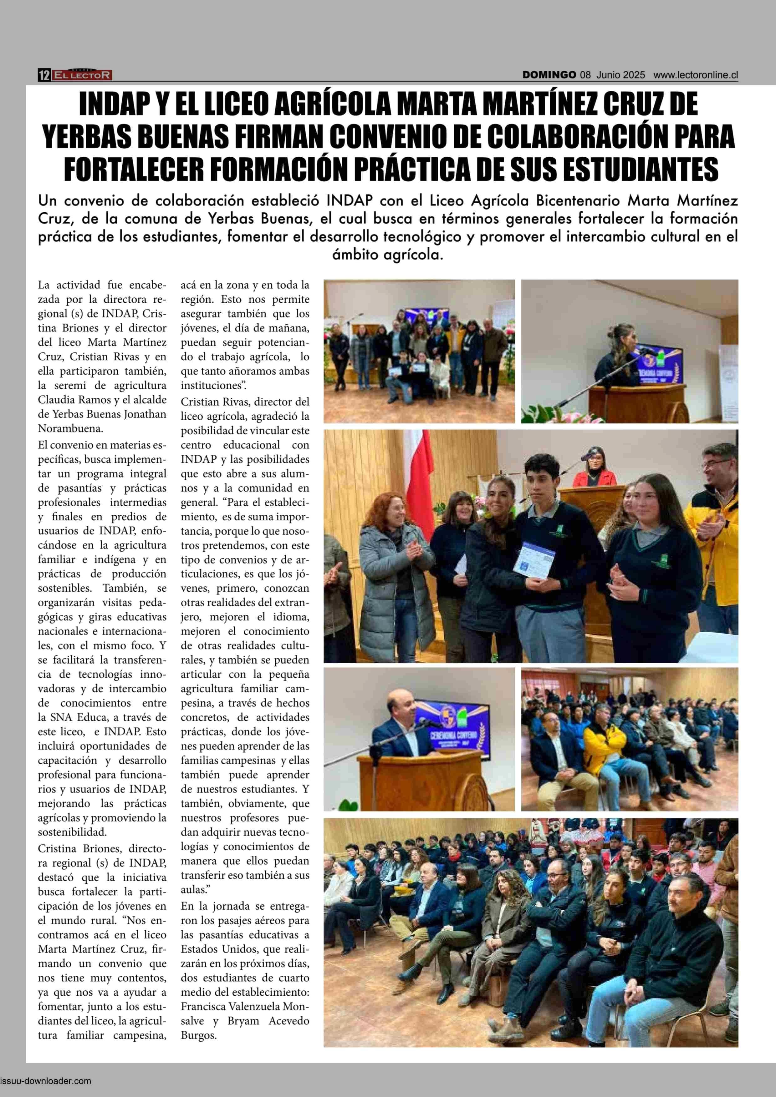 INDAP Y El LICEO AGRÍCOLA MARTA MARTÍNEZ CRUZ DE YERBAS BUENAS FIRMAN CONVENIO DE COLABORACIÓN PARA FORTALECER FORMACIÓN PRÁCTICA DE SUS ESTUDIANTES 08-06-2025 El Lector |