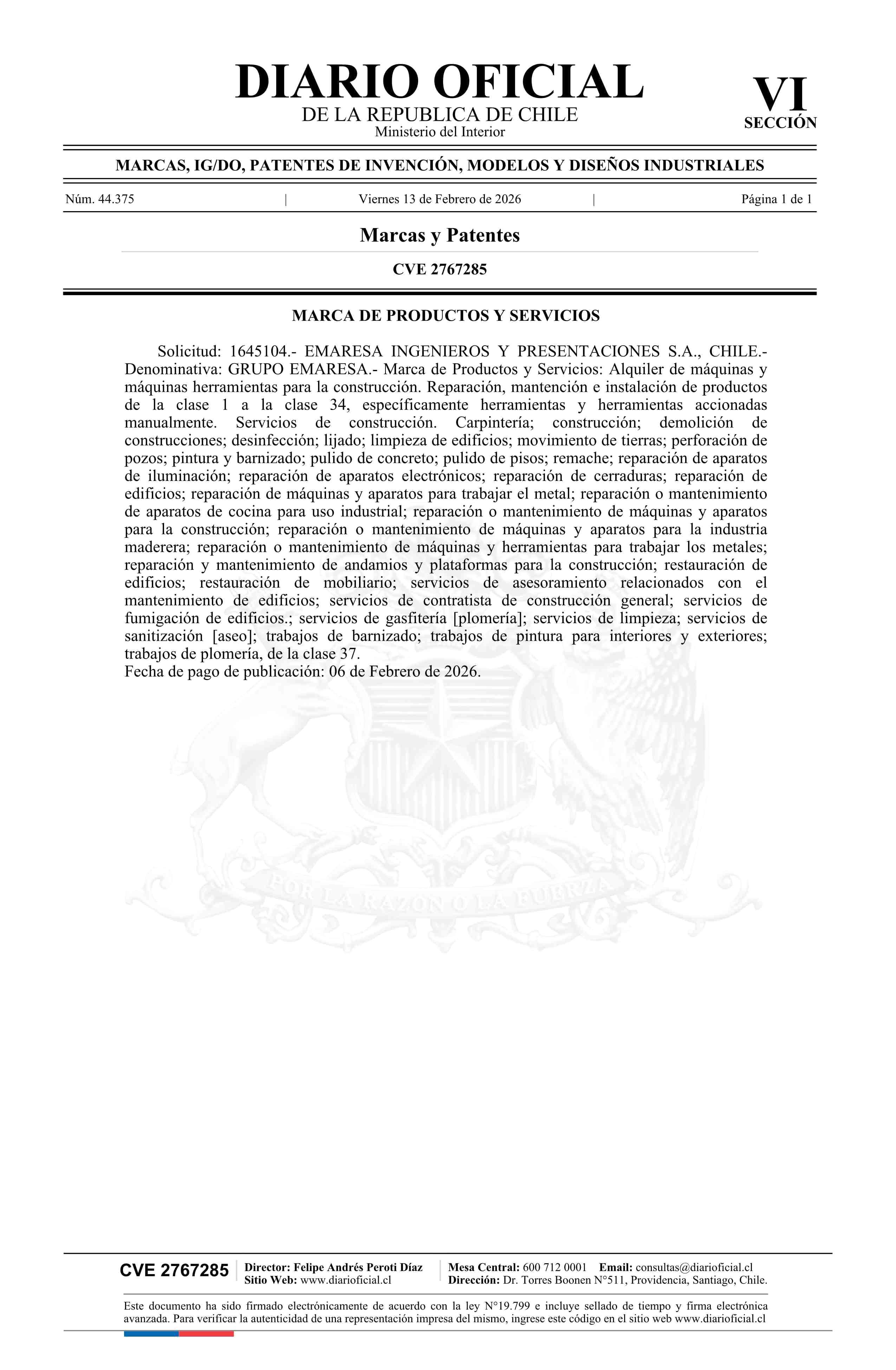 Solicitud número 1645104.- GRUPO EMARESA 13-02-2026 Diario Oficial Edición Electrónica |