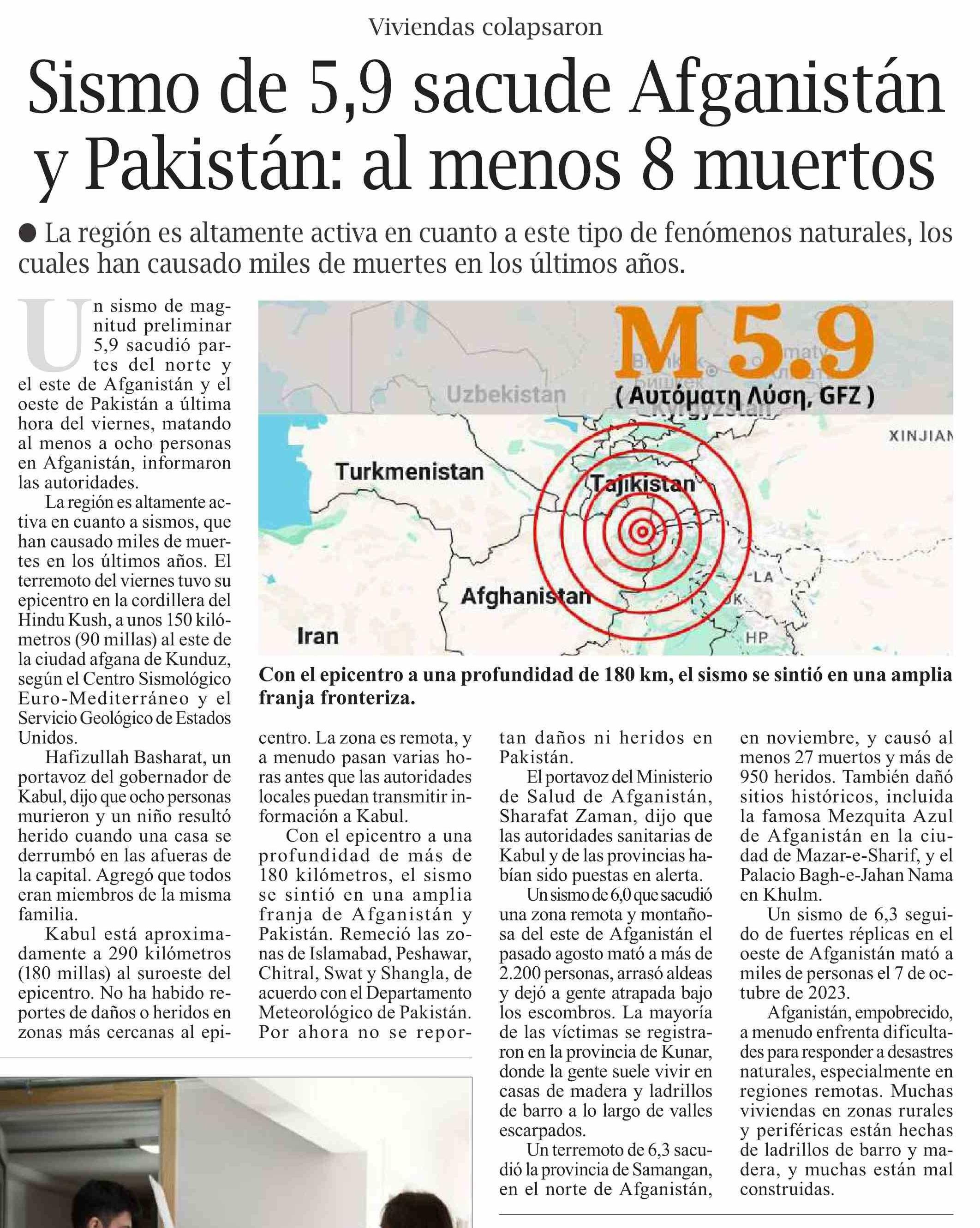| Título: | Sismo de 5,9 sacude Afganistán y Pakistán: al menos 8 muertos |
