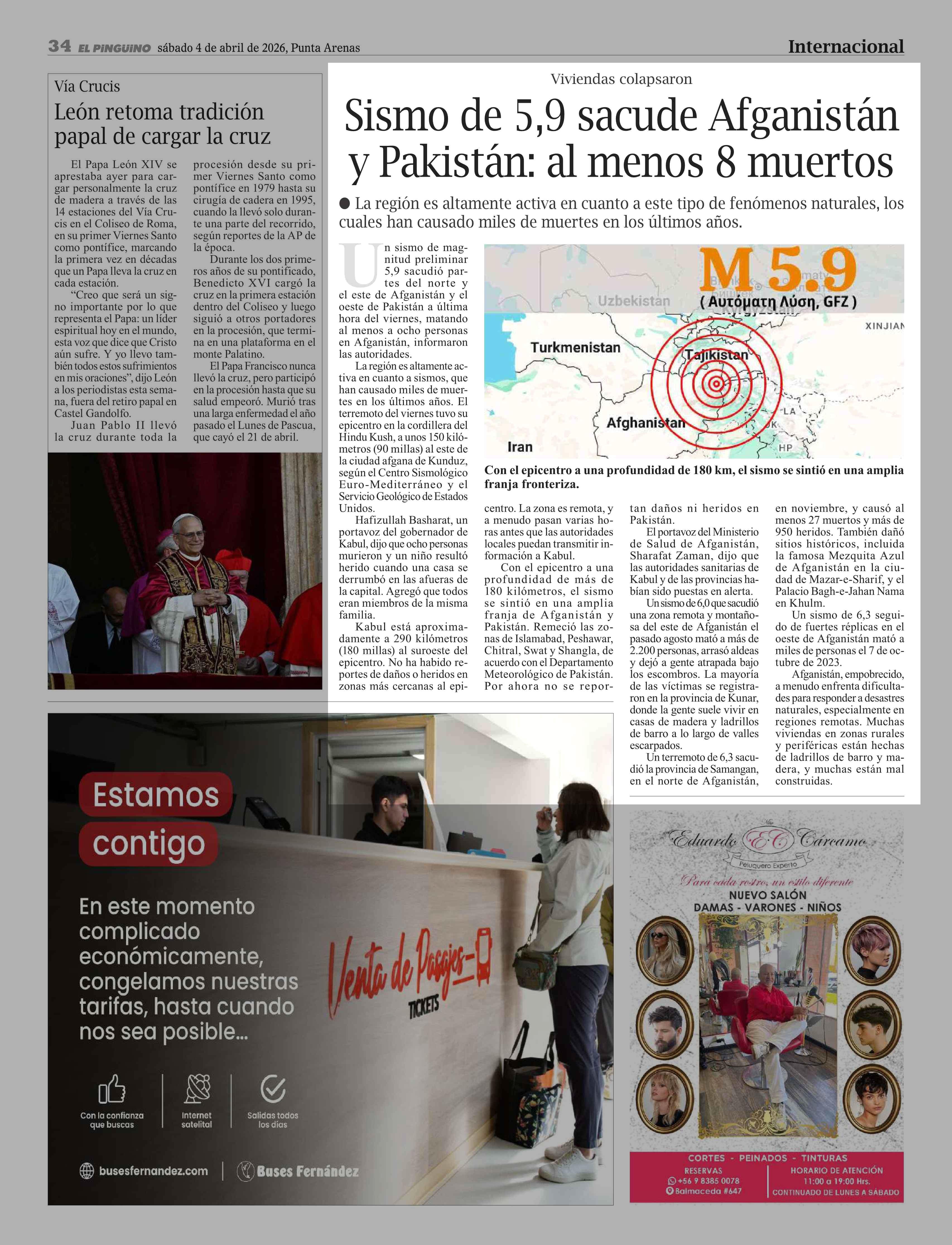 Sismo de 5,9 sacude Afganistán y Pakistán: al menos 8 muertos 04-04-2026 El Pingüino |