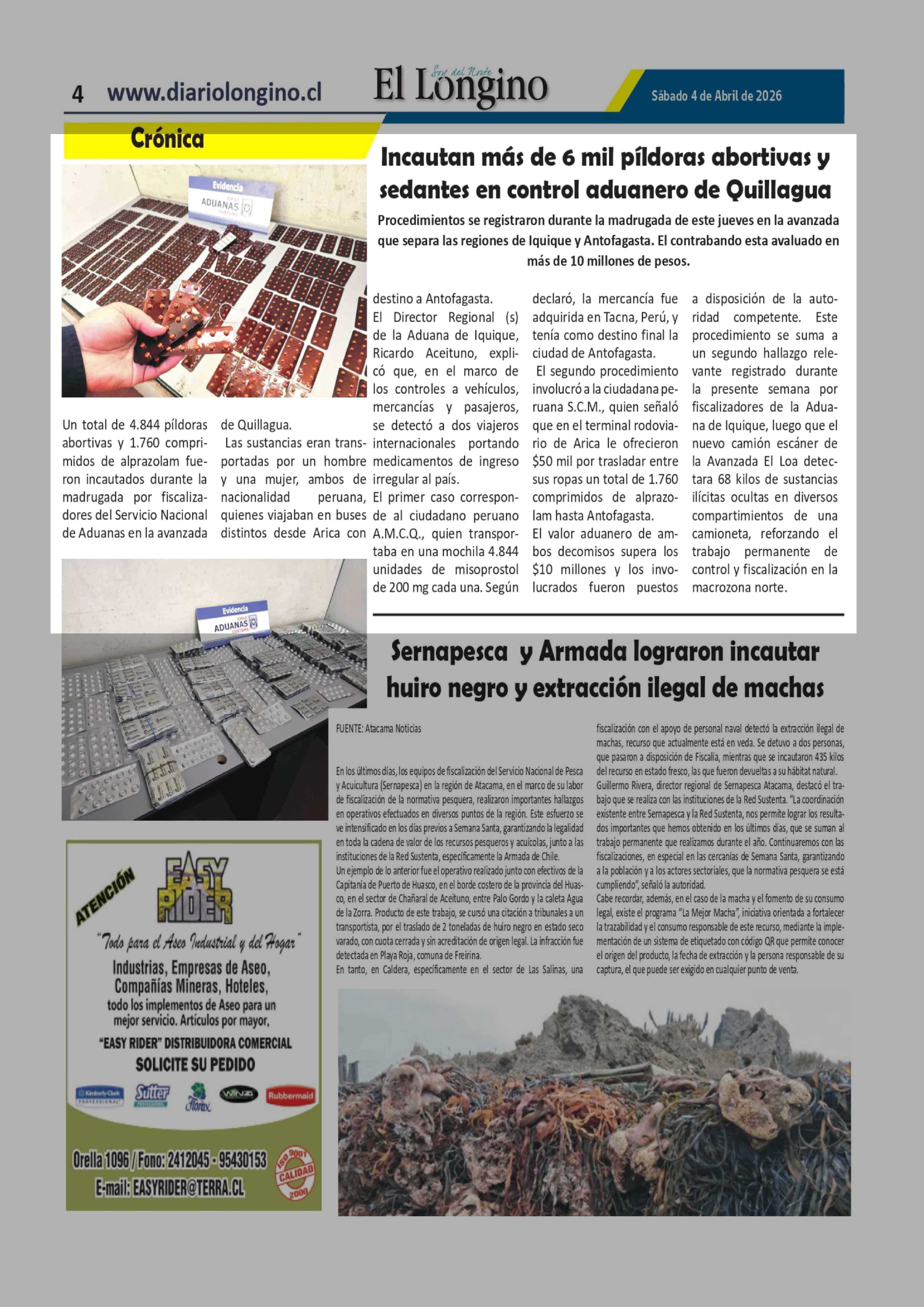 Incautan más de 6 mil píldoras abortivas y sedantes en control aduanero de Quillagua 04-04-2026 El Longino |