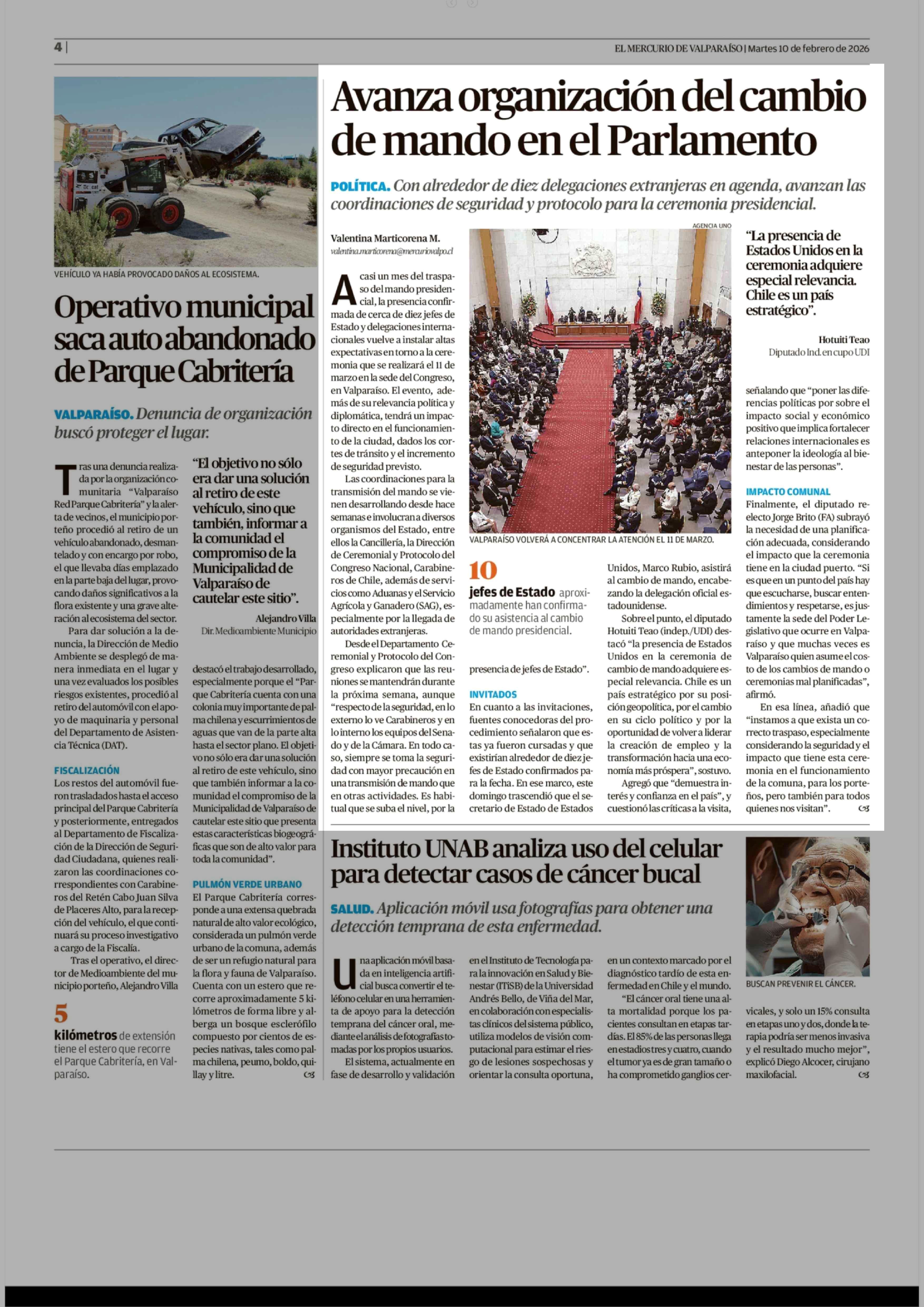 Avanza organización del cambio de mando en el Parlamento 10-02-2026 El Mercurio de Valparaíso |