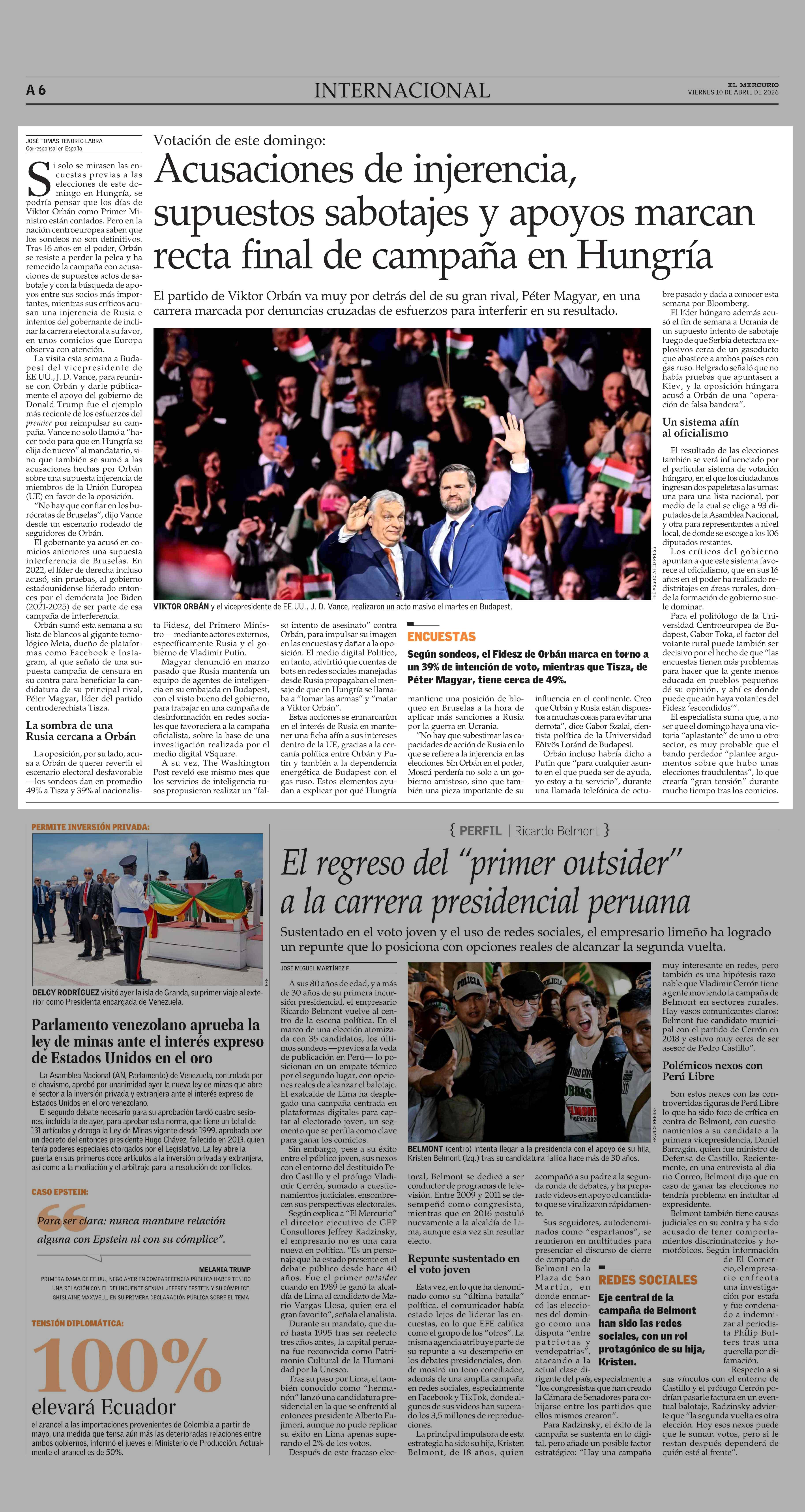 Acusaciones de injerencia, supuestos sabotajes y apoyos marcan recta final de campaña en Hungría 10-04-2026 El Mercurio |