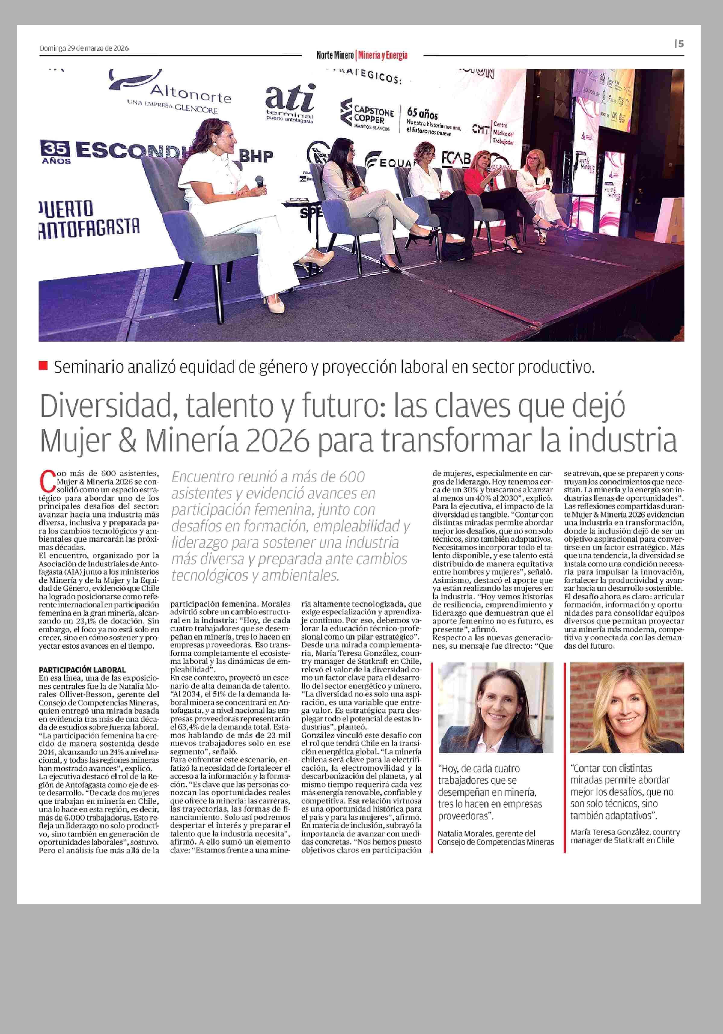 Diversidad, talento y futuro: las claves que dejó Mujer €: Minería 2026 para transformar la industria 29-03-2026 El Mercurio de Calama |