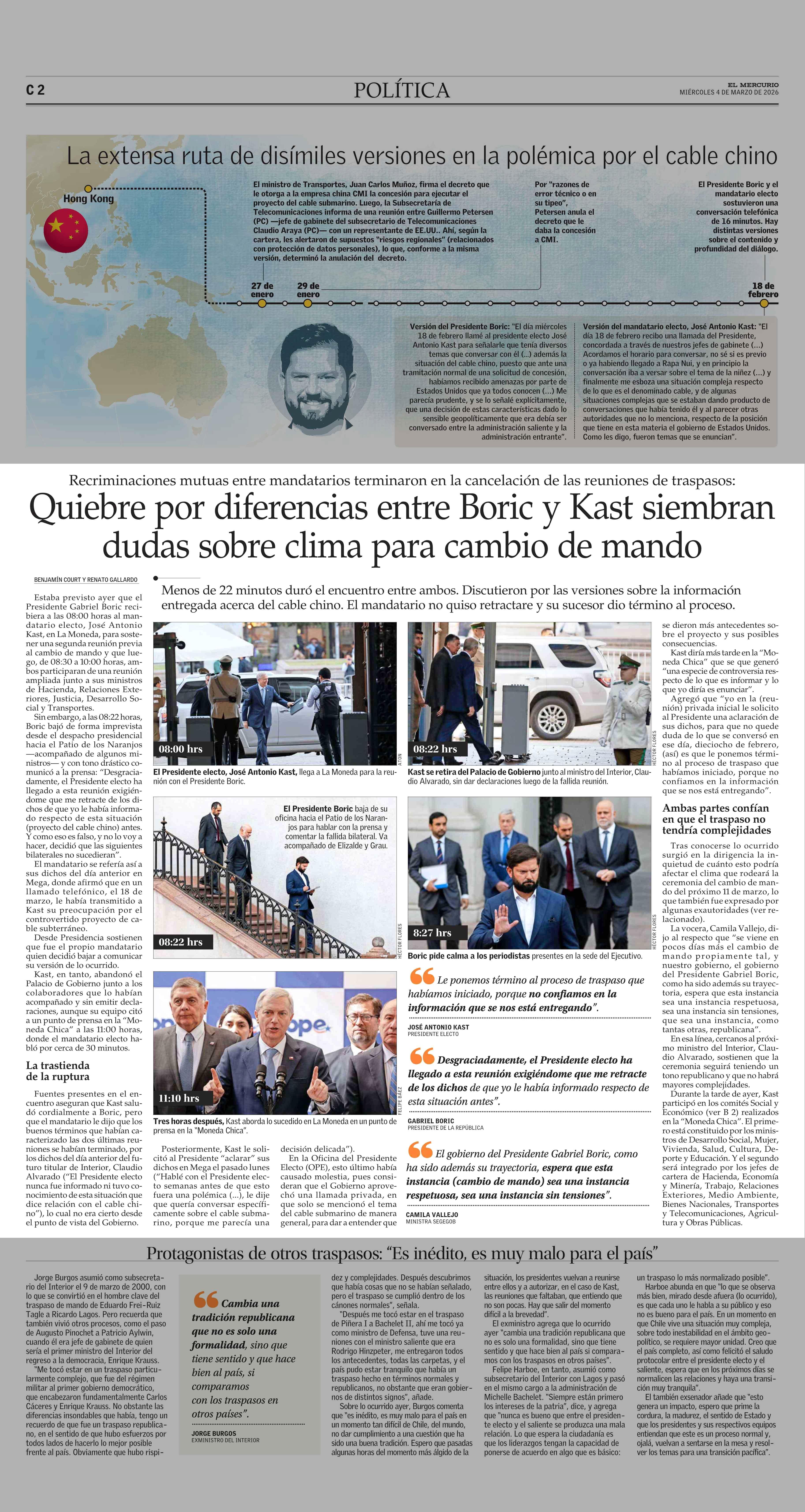 Quiebre por diferencias entre Boric y Kast siembran dudas sobre clima para cambio de mando 04-03-2026 El Mercurio |
