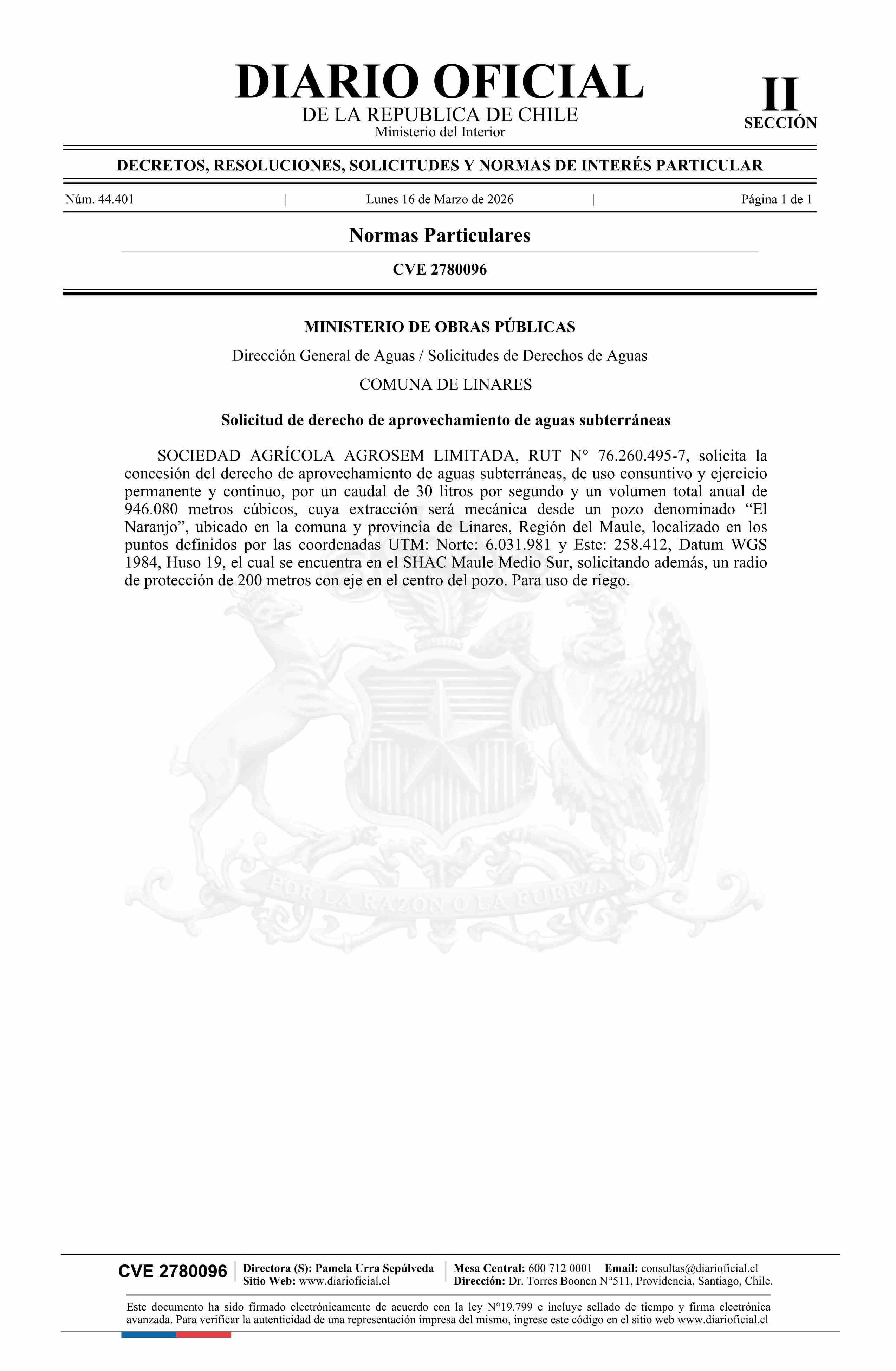 Solicitud Sociedad Agrícola Agrosem Limitada 16-03-2026 Diario Oficial Edición Electrónica |