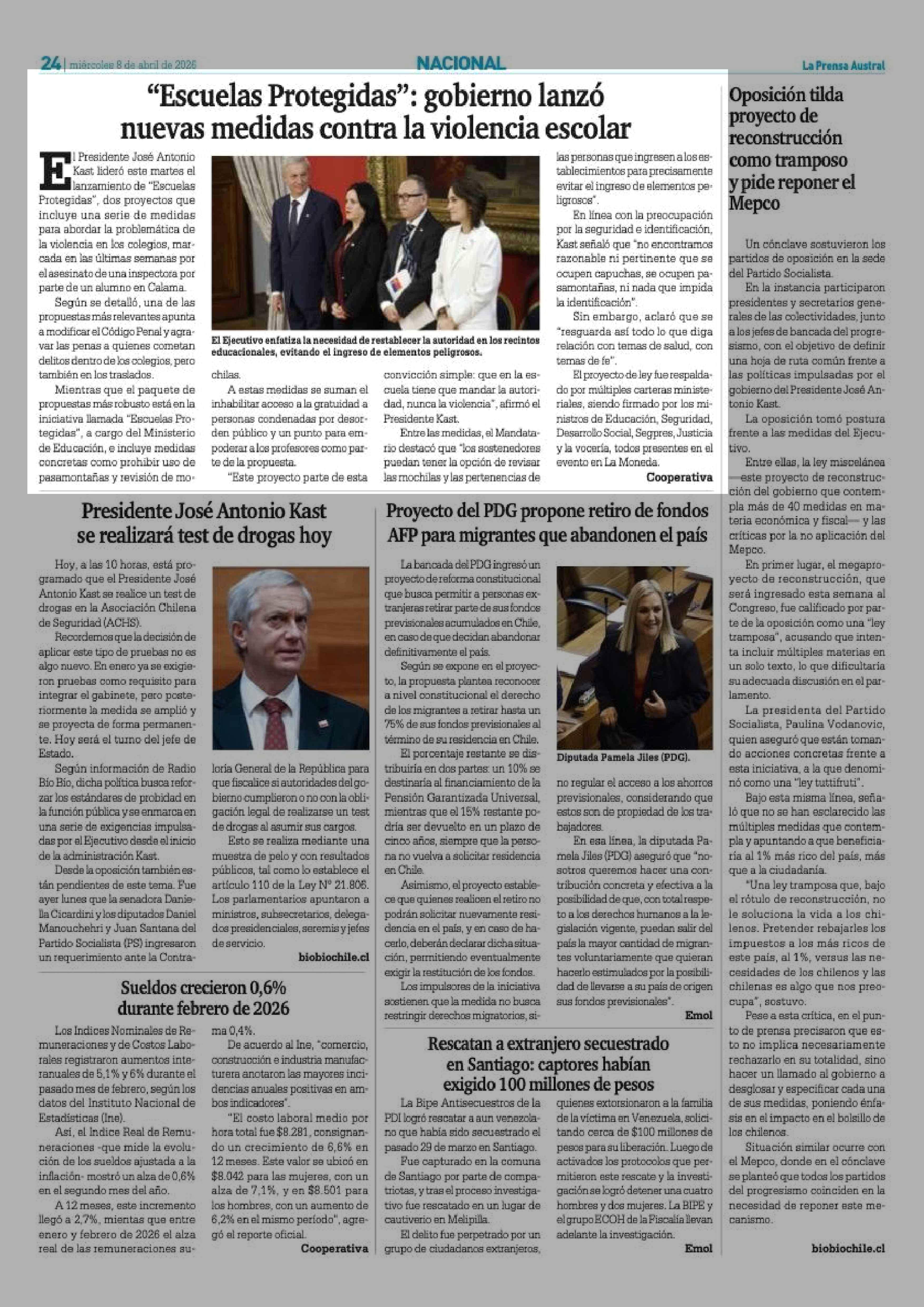 "Escuelas Protegidas": gobierno lanzó nuevas medidas contra la violencia escolar 08-04-2026 La Prensa Austral |