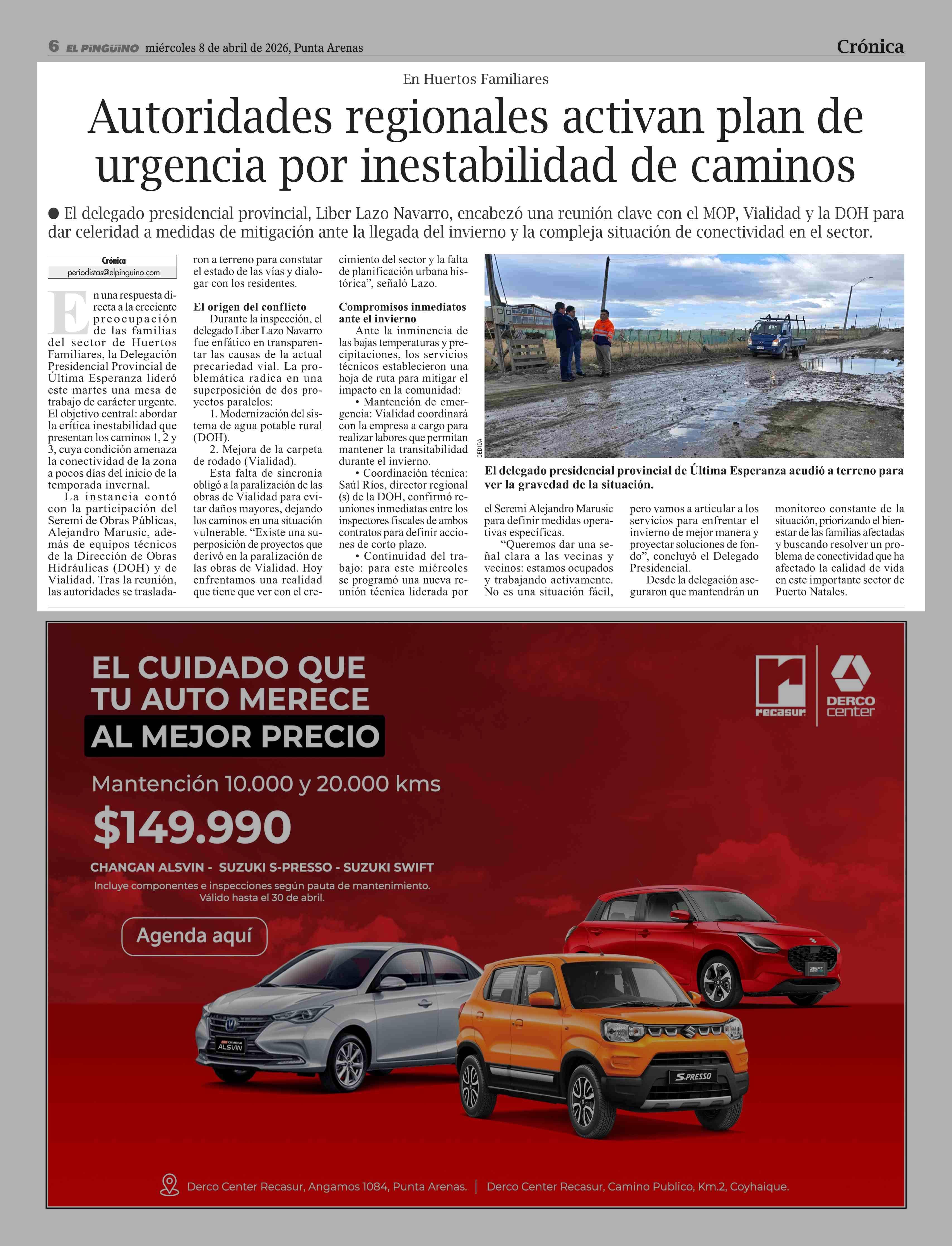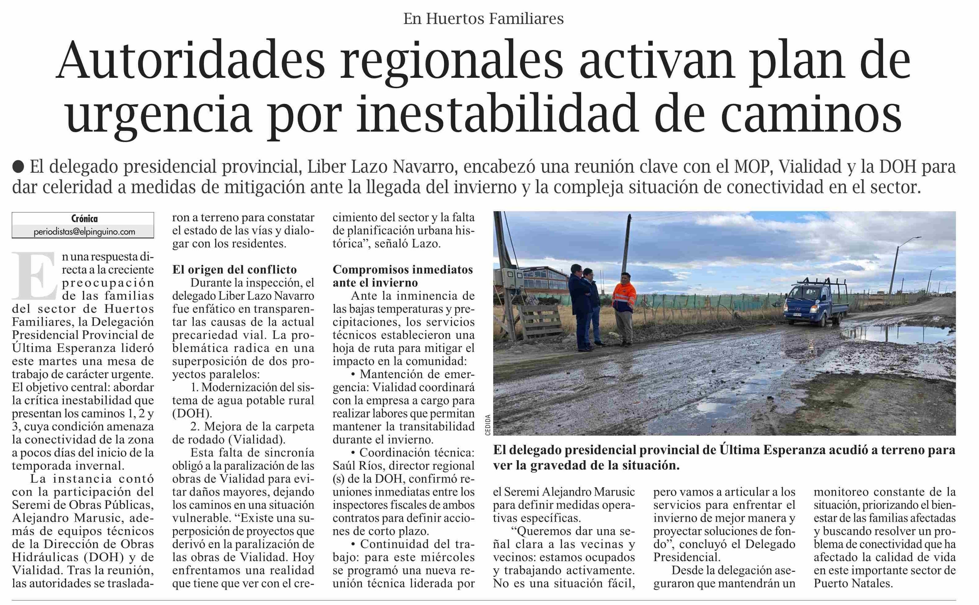 Autoridades regionales activan plan de urgencia por inestabilidad de caminos 08-04-2026 El Pingüino |
