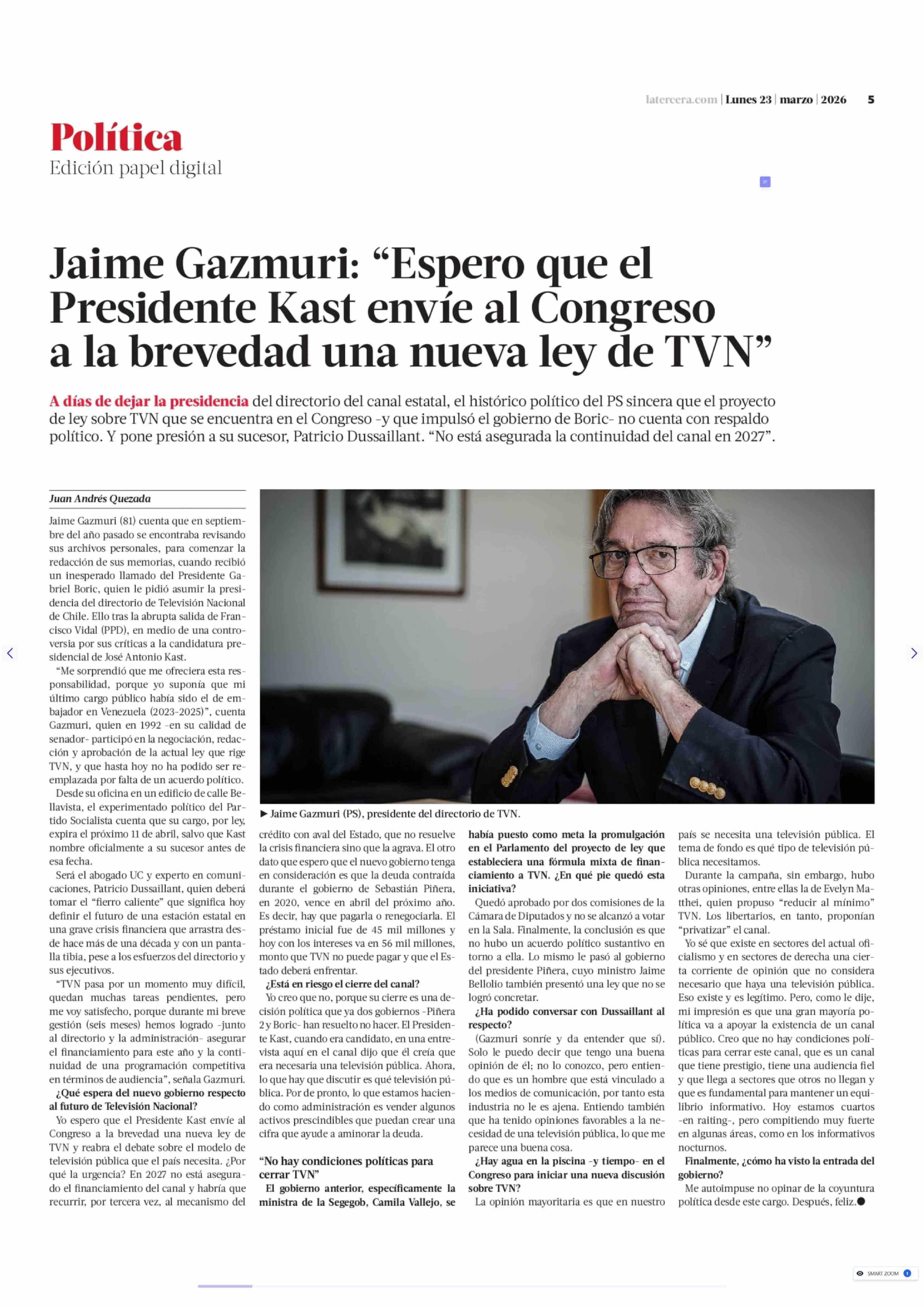 Jaime Gazmuri: "Espero que el Presidente Kast envíe al Congreso a la brevedad una nueva ley de TVN" 23-03-2026 La Tercera |