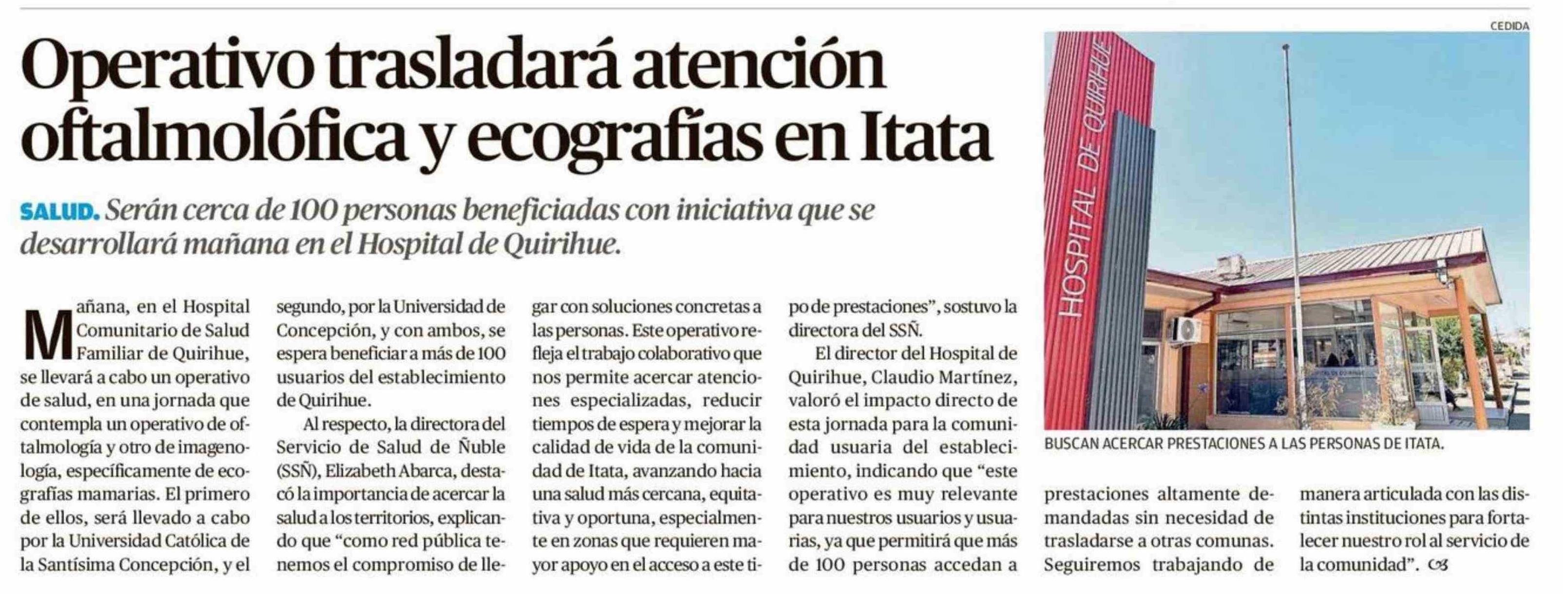 | Título: | Operativo trasladará atención oftalmolófica y ecografías en Itata |