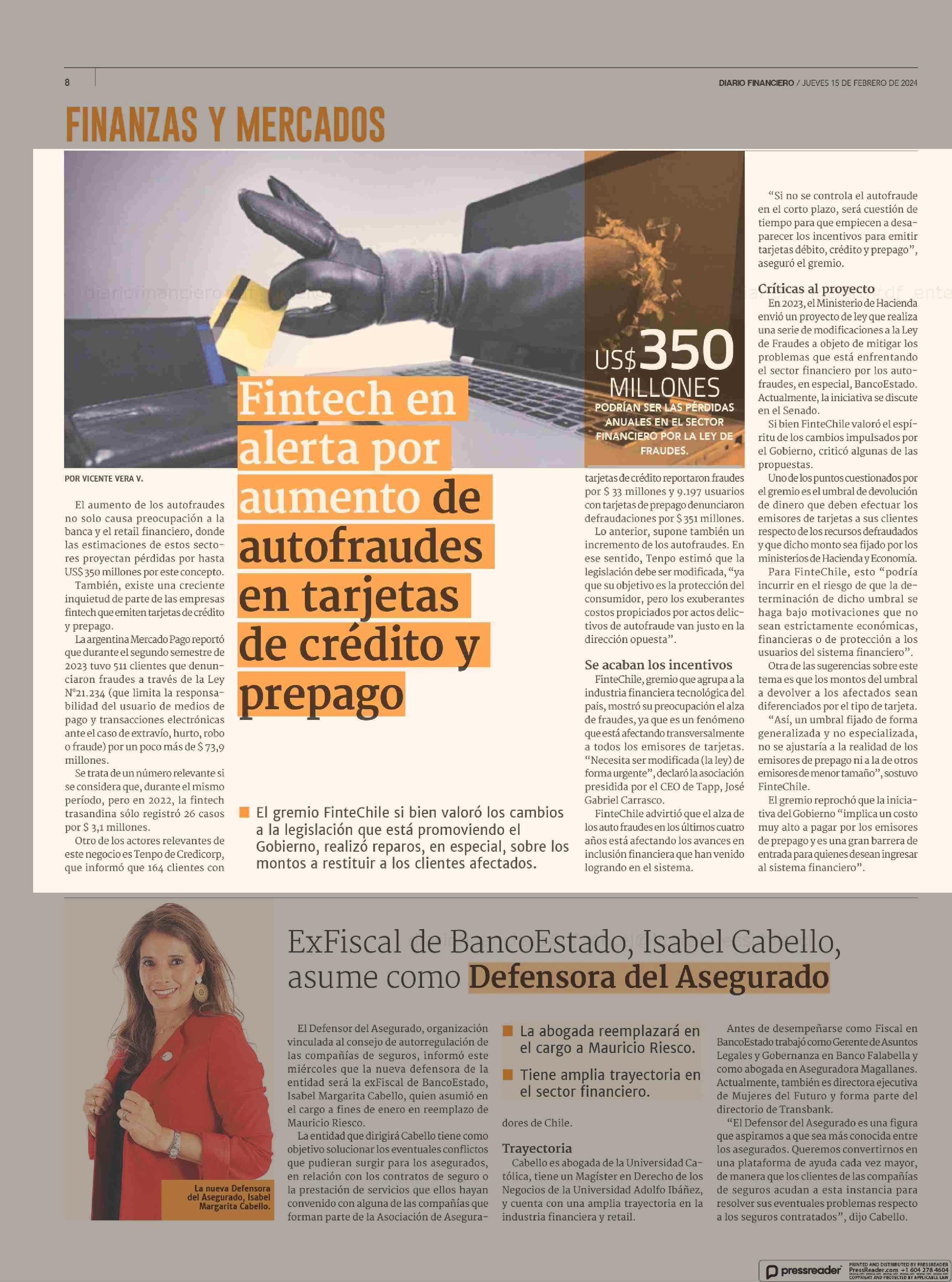 Fintech en alerta por aumento de autofraudes en tarjetas de crédito y prepago 15-02-2024 Diario Financiero |