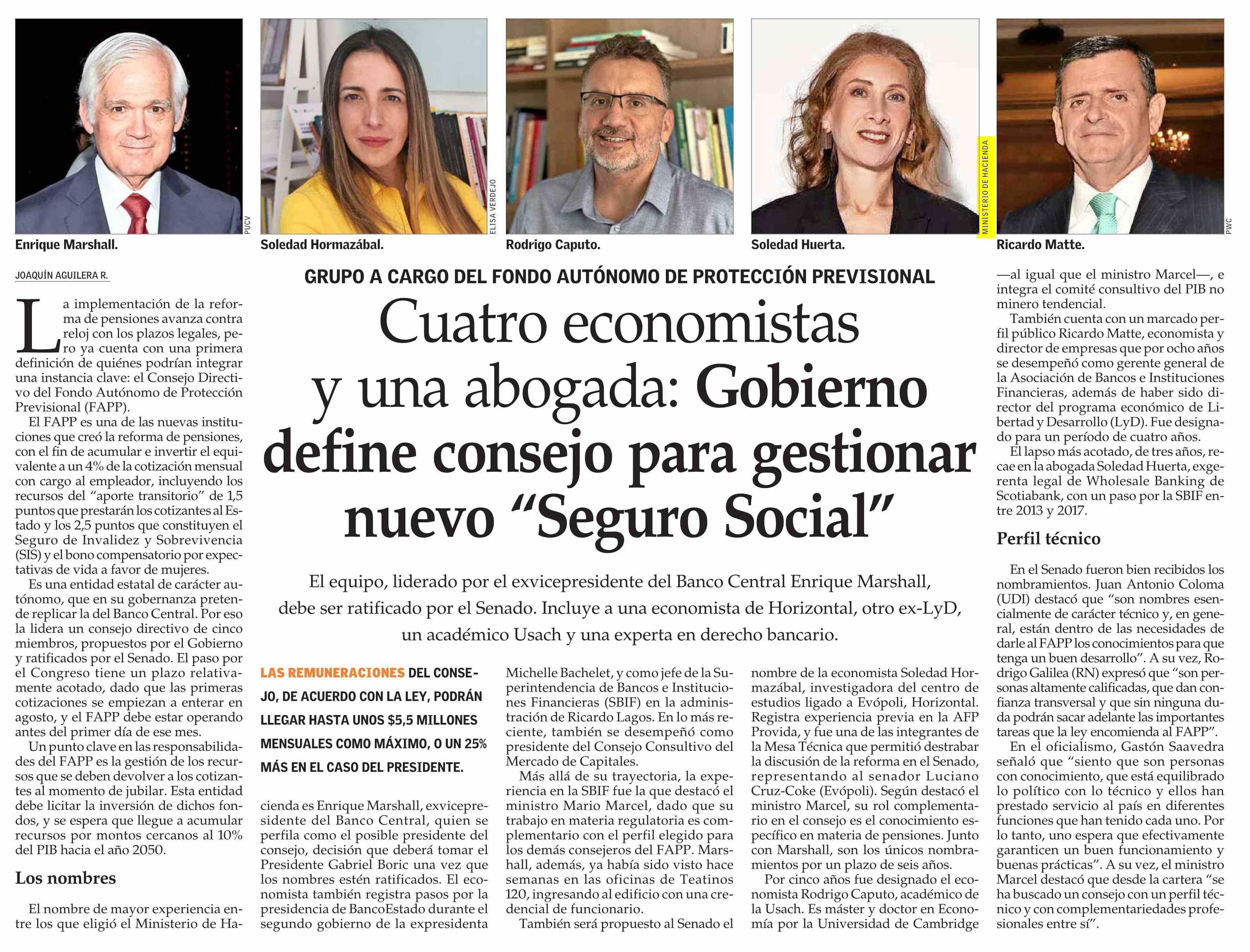 Cuatro economistas y una abogada: Gobierno define consejo para gestionar nuevo “Seguro Social” 03-05-2025 El Mercurio |