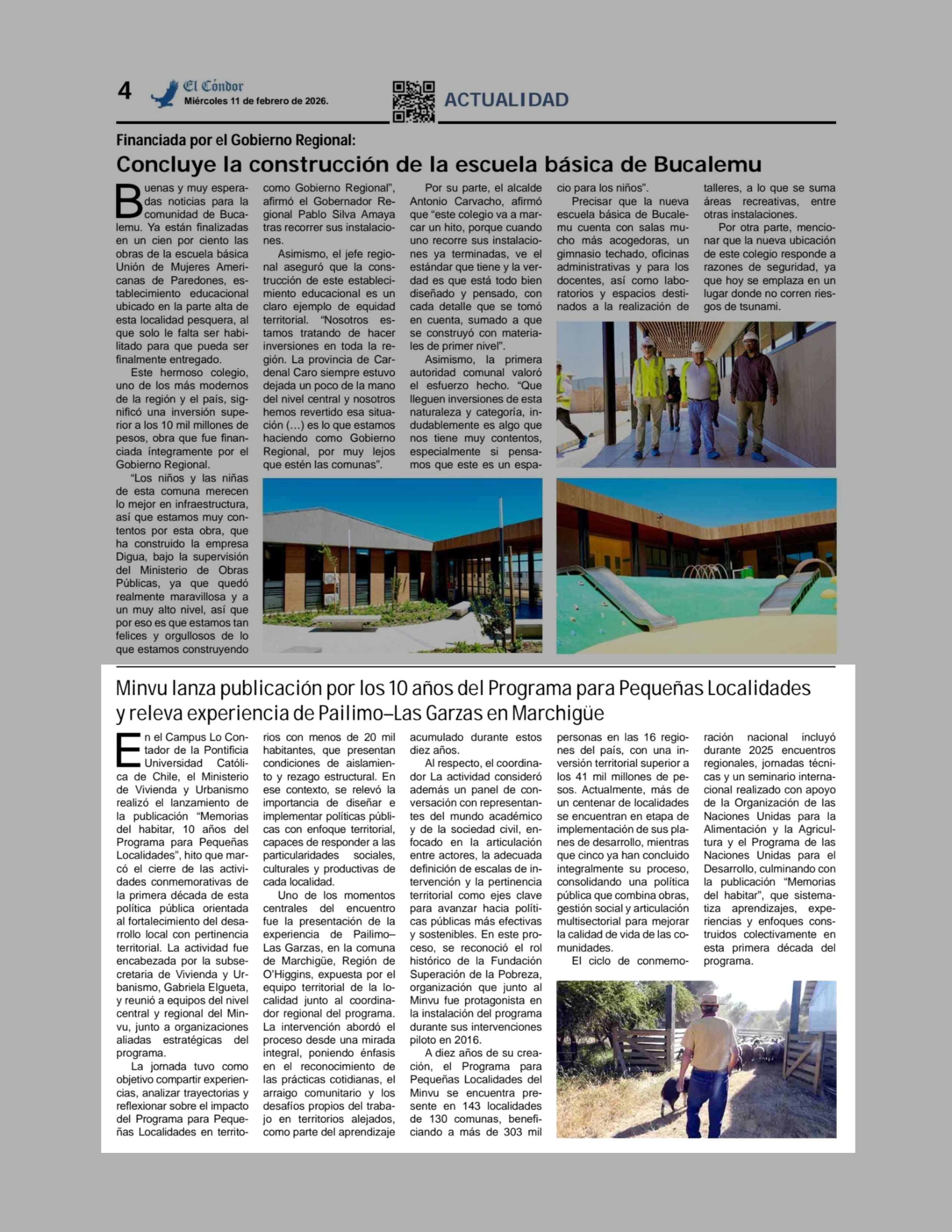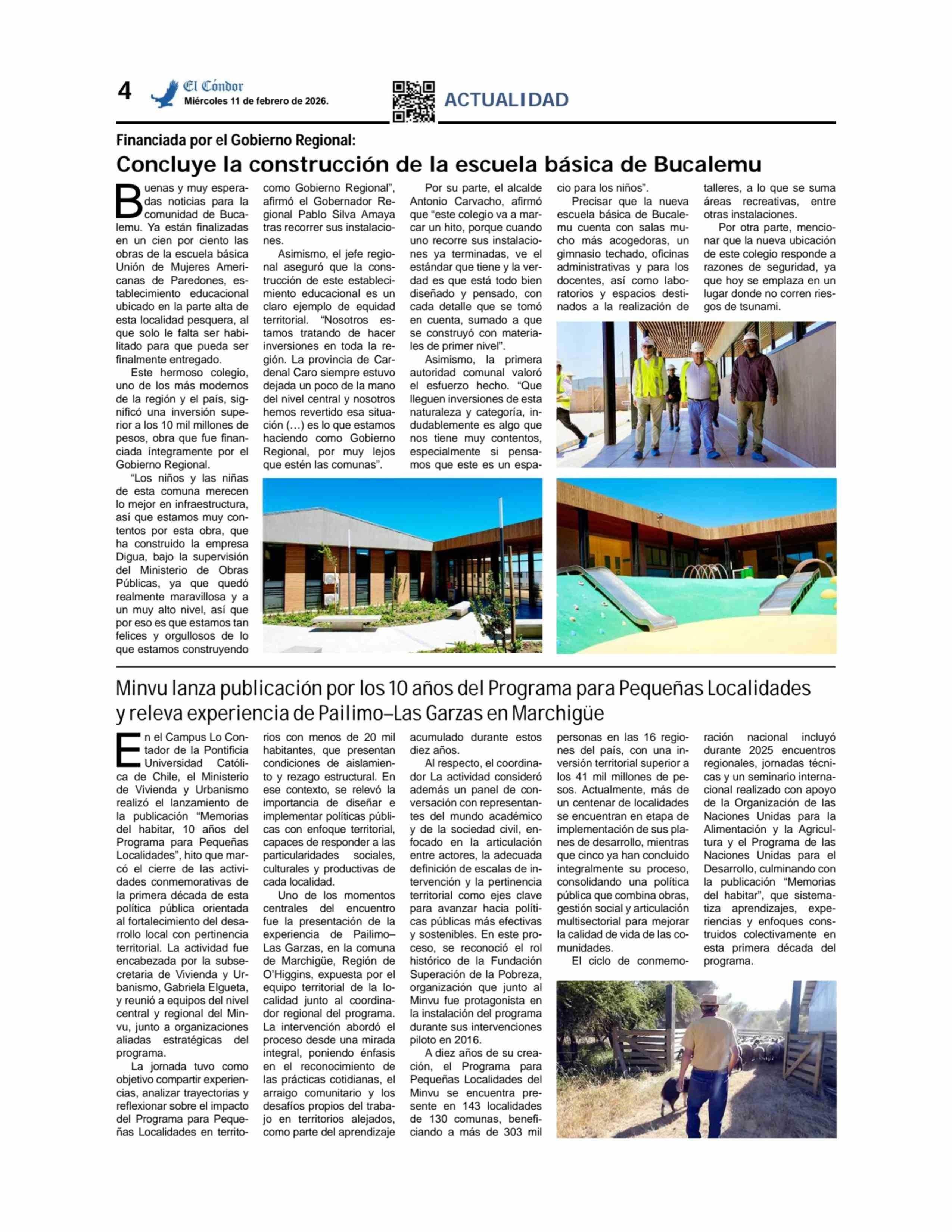 Minvu lanza publicación por los 10 años del Programa para Pequeñas Localidades y releva experiencia de Pailimo-Las Garzas en Marchigüe 11-02-2026 Diario El Cóndor |