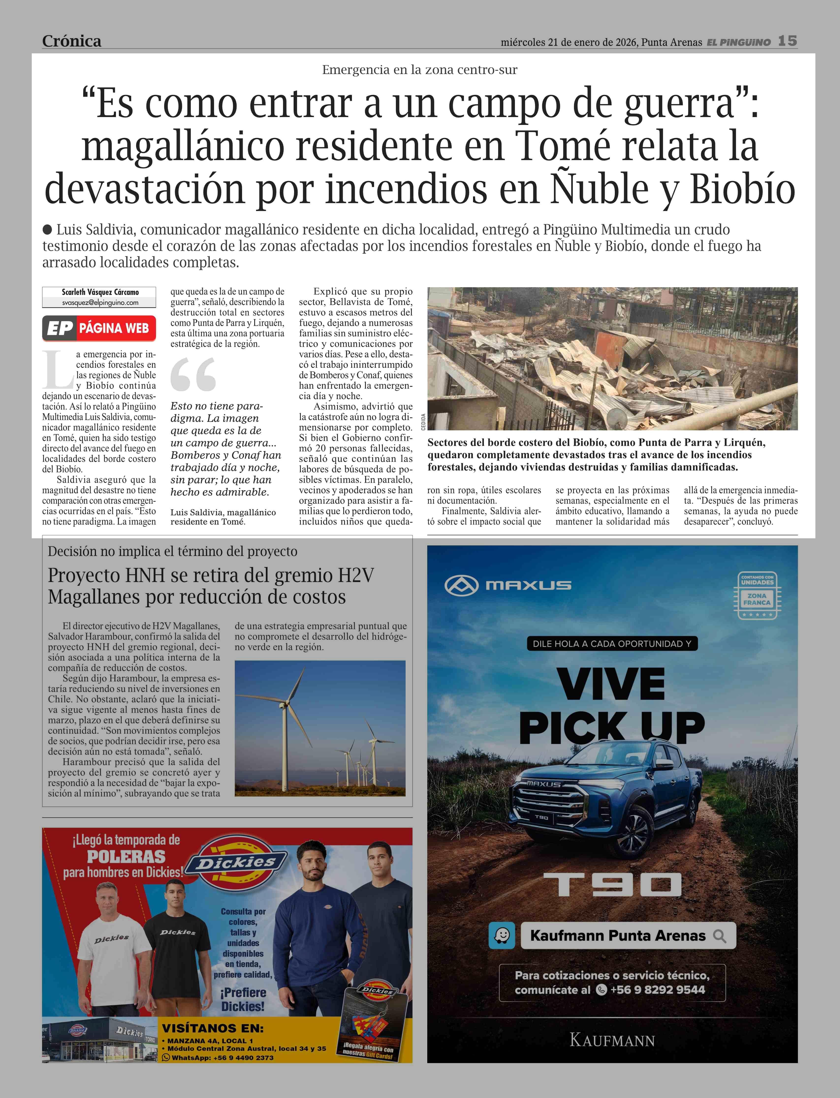 "Es como entrar a un campo de guerra": magallánico residente en Tomé relata la devastación por incendios en Nuble y Biobío 21-01-2026 El Pingüino |