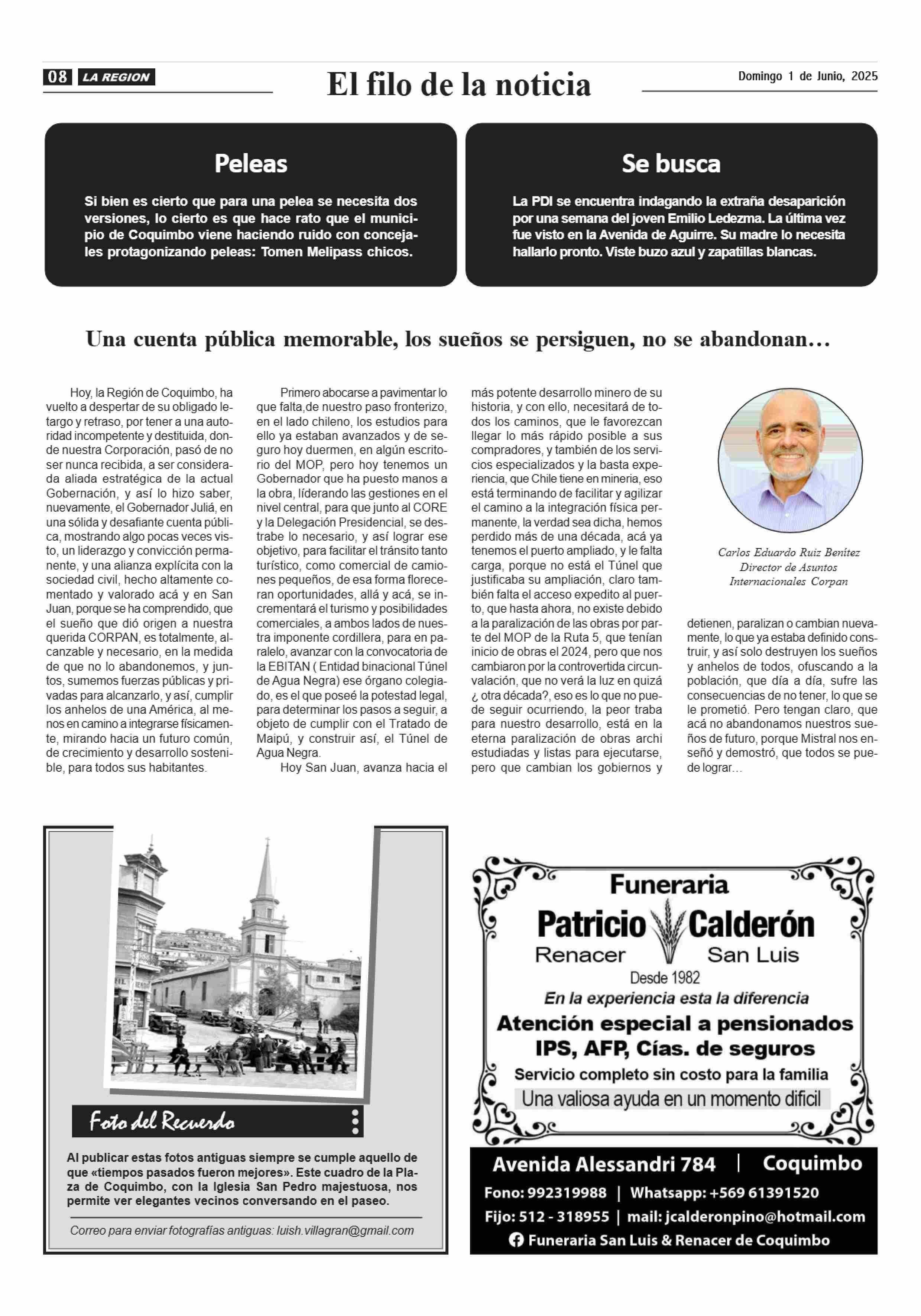 COLUMNAS DE OPINIÓN: Una cuenta pública memorable, los sueños se persiguen, no se abandonan... 01-06-2025 Diario la Región |