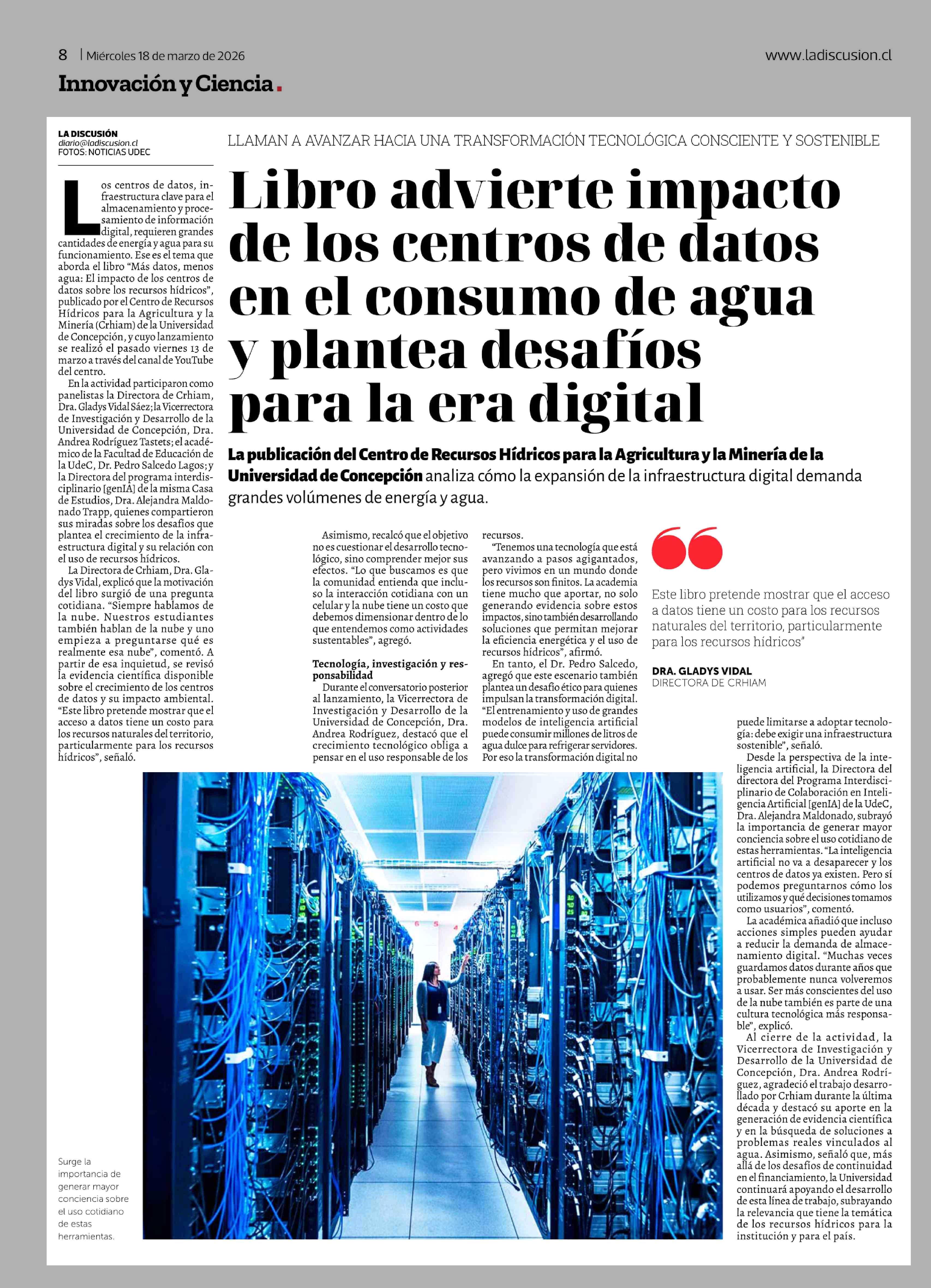 Libro advierte impacto de los centros de datos en el consumo de agua y plantea desafíos para la era digital 18-03-2026 La Discusión |