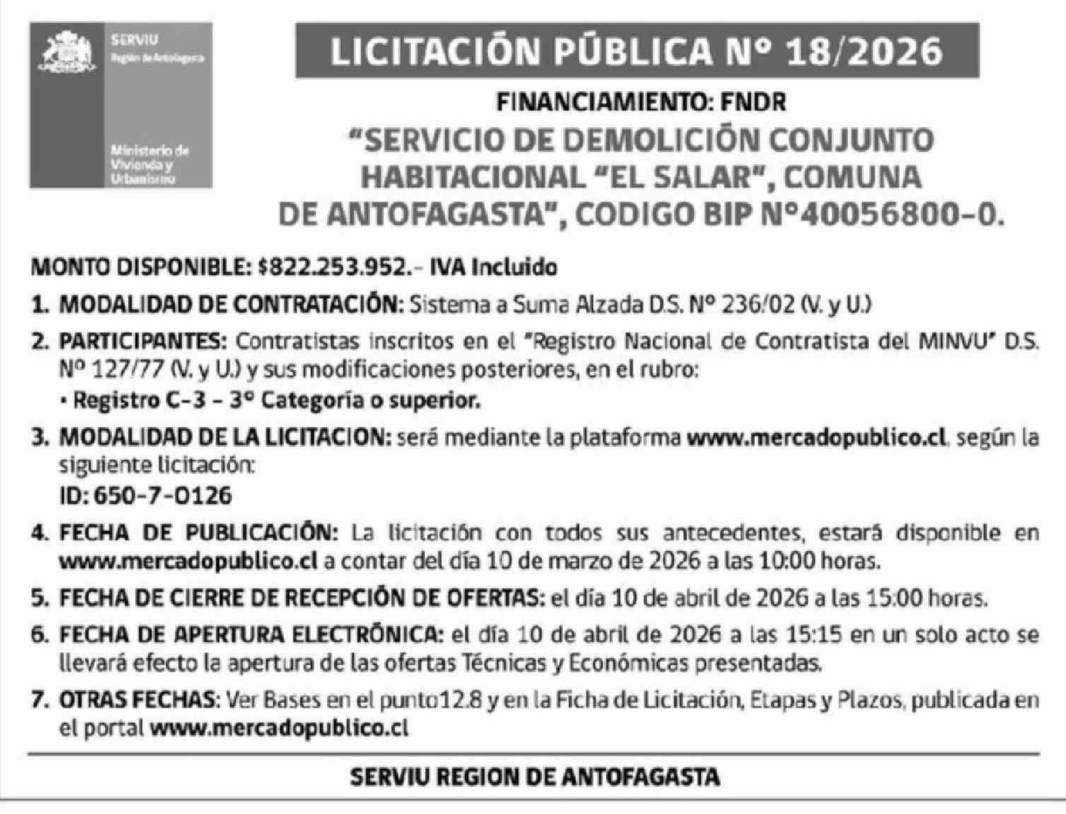 | Fecha: | 10-03-2026 | Sector: | Aviso Licitaciones | Región: | Región de Antofagasta |