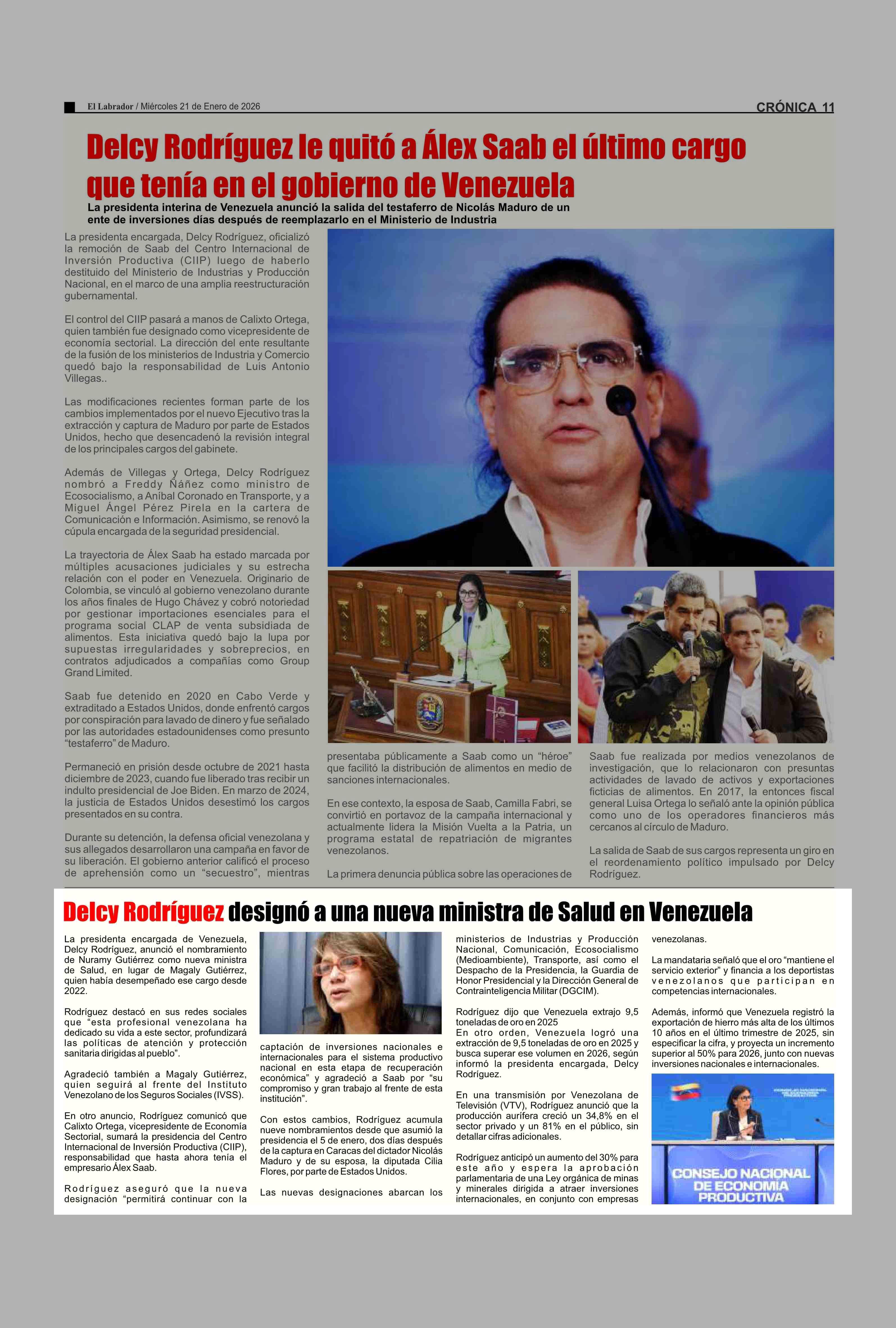 Delcy Rodríguez designó a una nueva ministra de Salud en Venezuela 21-01-2026 El Labrador |