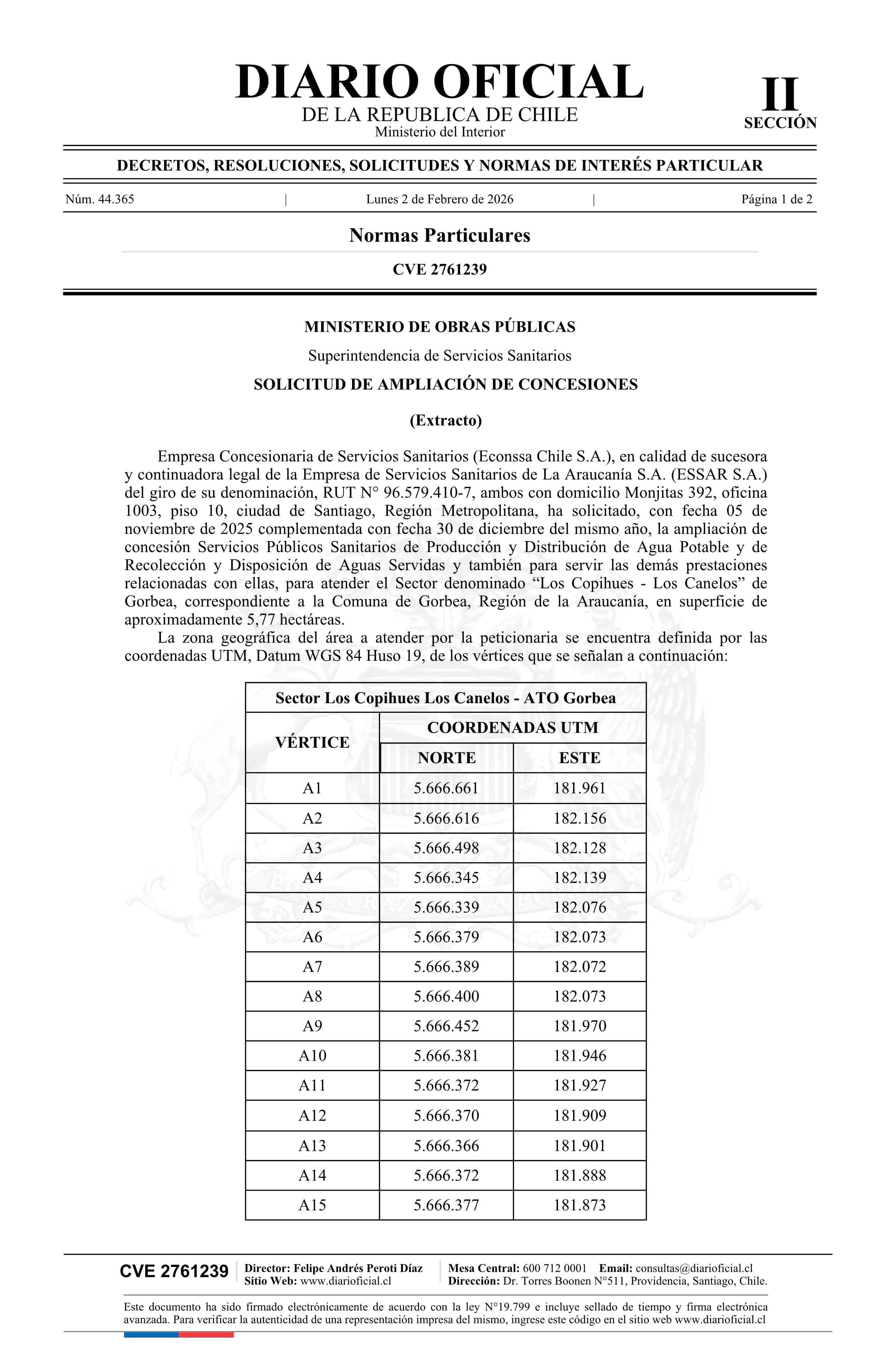 Título: Solicitud de ampliación de concesión de servicios sanitarios de producción y distribución de agua potable y recolección y disposición de aguas servidas