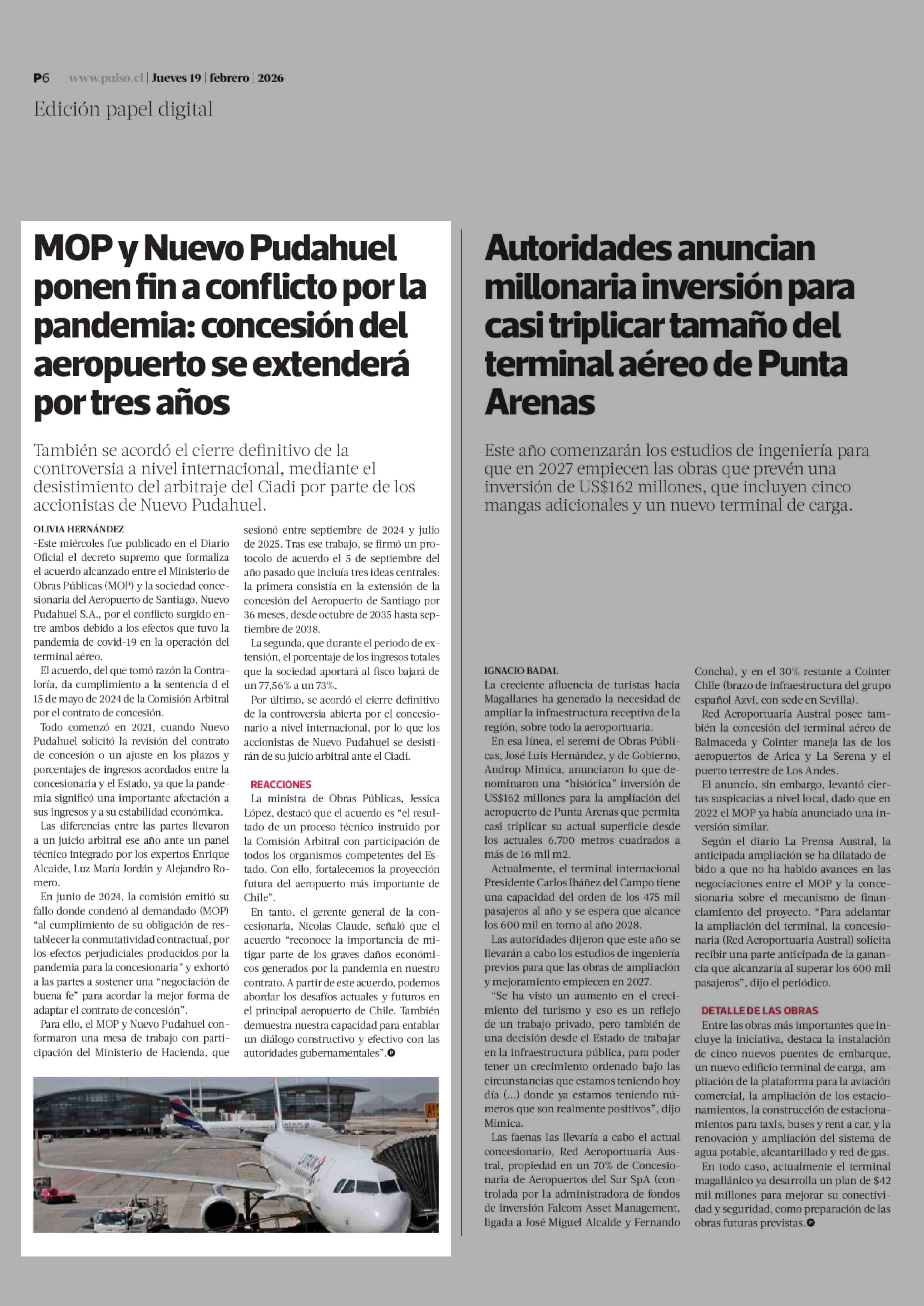 Título: MOP y Nuevo Pudahuel ponen fin a conflicto por la pandemia: concesión del aeropuerto se extenderá por tres años
