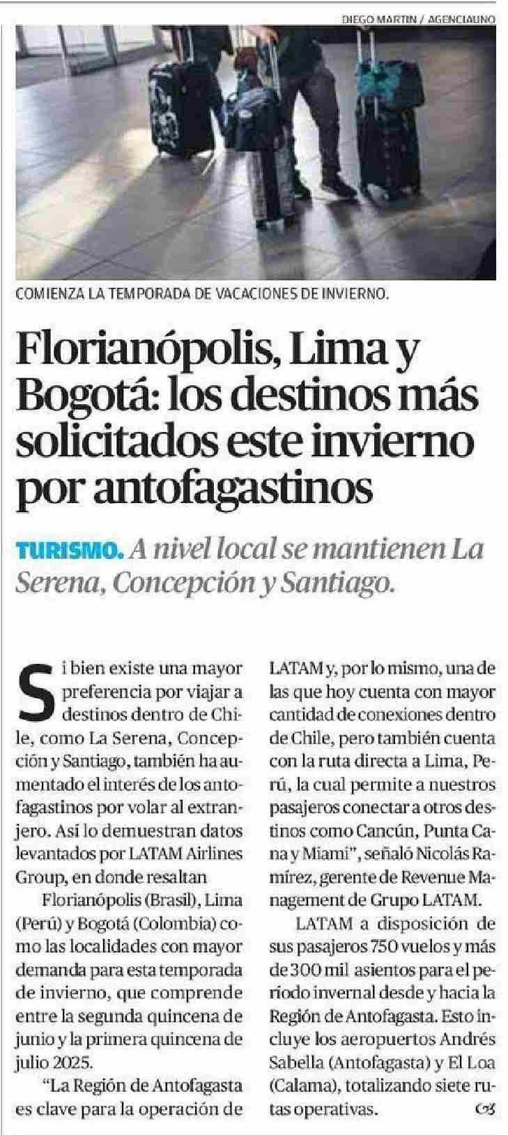 Título: Florianópolis, Lima y Bogotá: los destinos más solicitados este invierno por antofagastinos