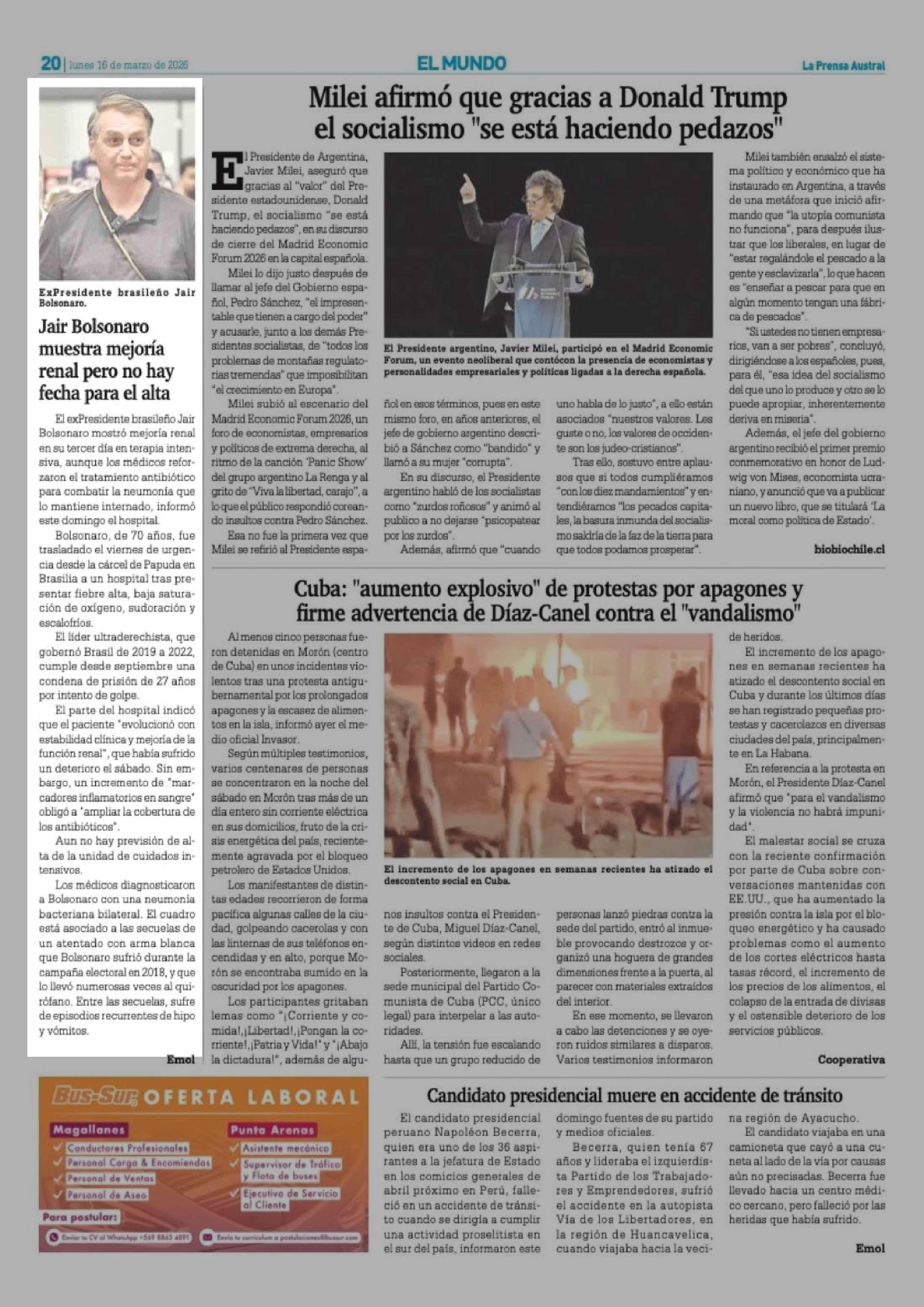 Jair Bolsonaro muestra mejoría renal pero no hay fecha para el alta 16-03-2026 La Prensa Austral |