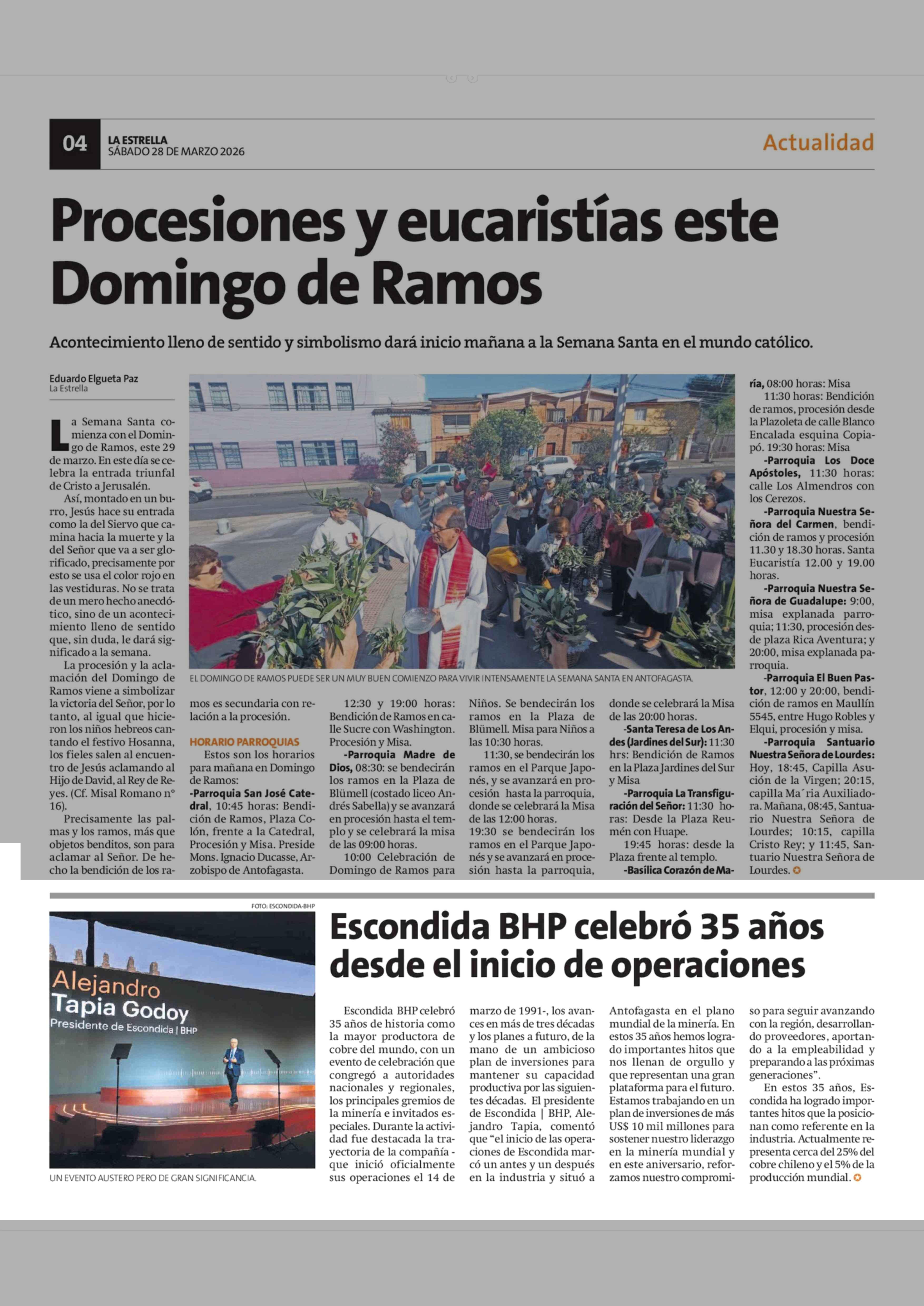 Escondida BHP celebró 35 años desde el inicio de operaciones 28-03-2026 La Estrella de Antofagasta |