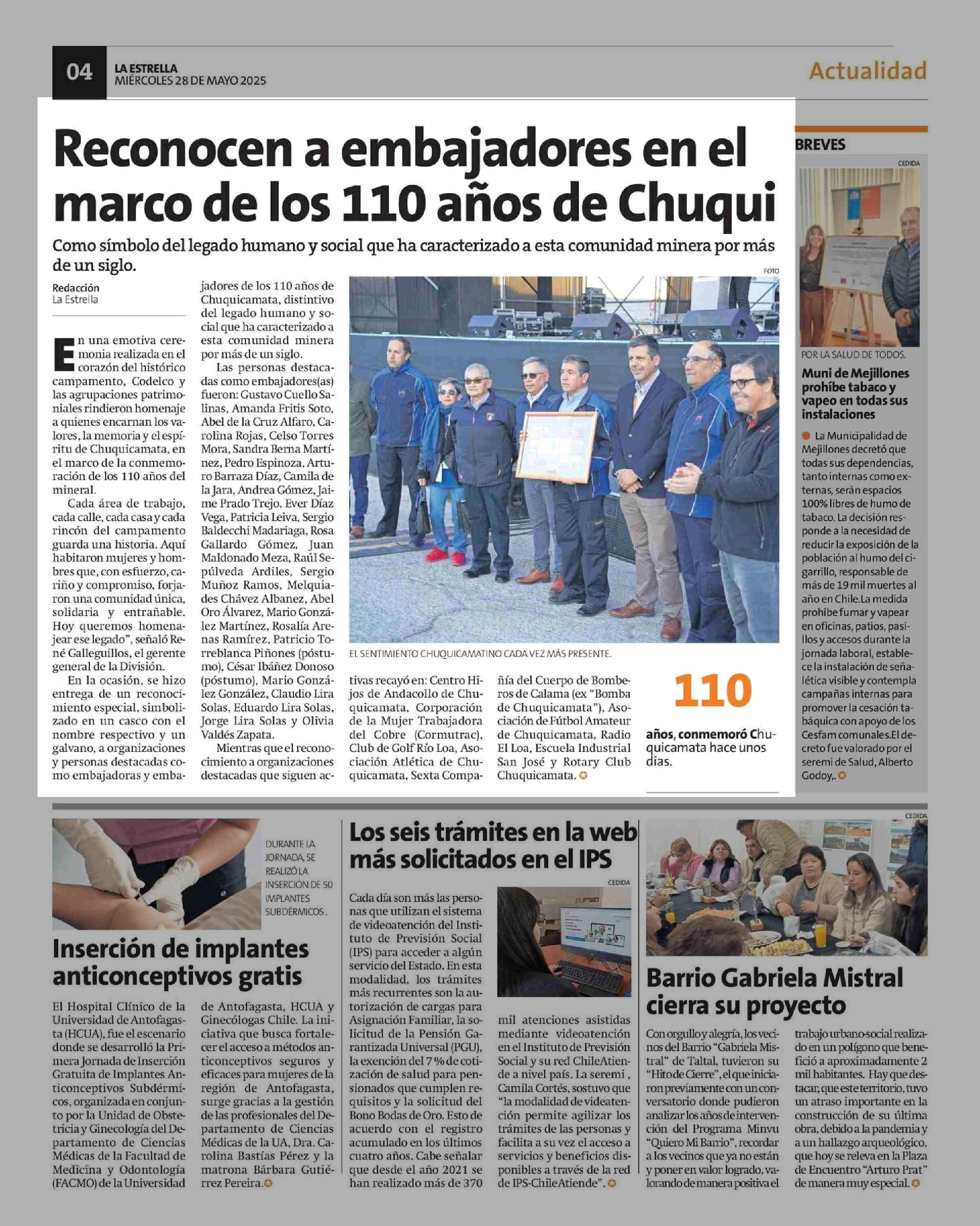 Reconocen a embajadores en el marco de los 110 años de Chuqui 28-05-2025 La Estrella de Antofagasta |