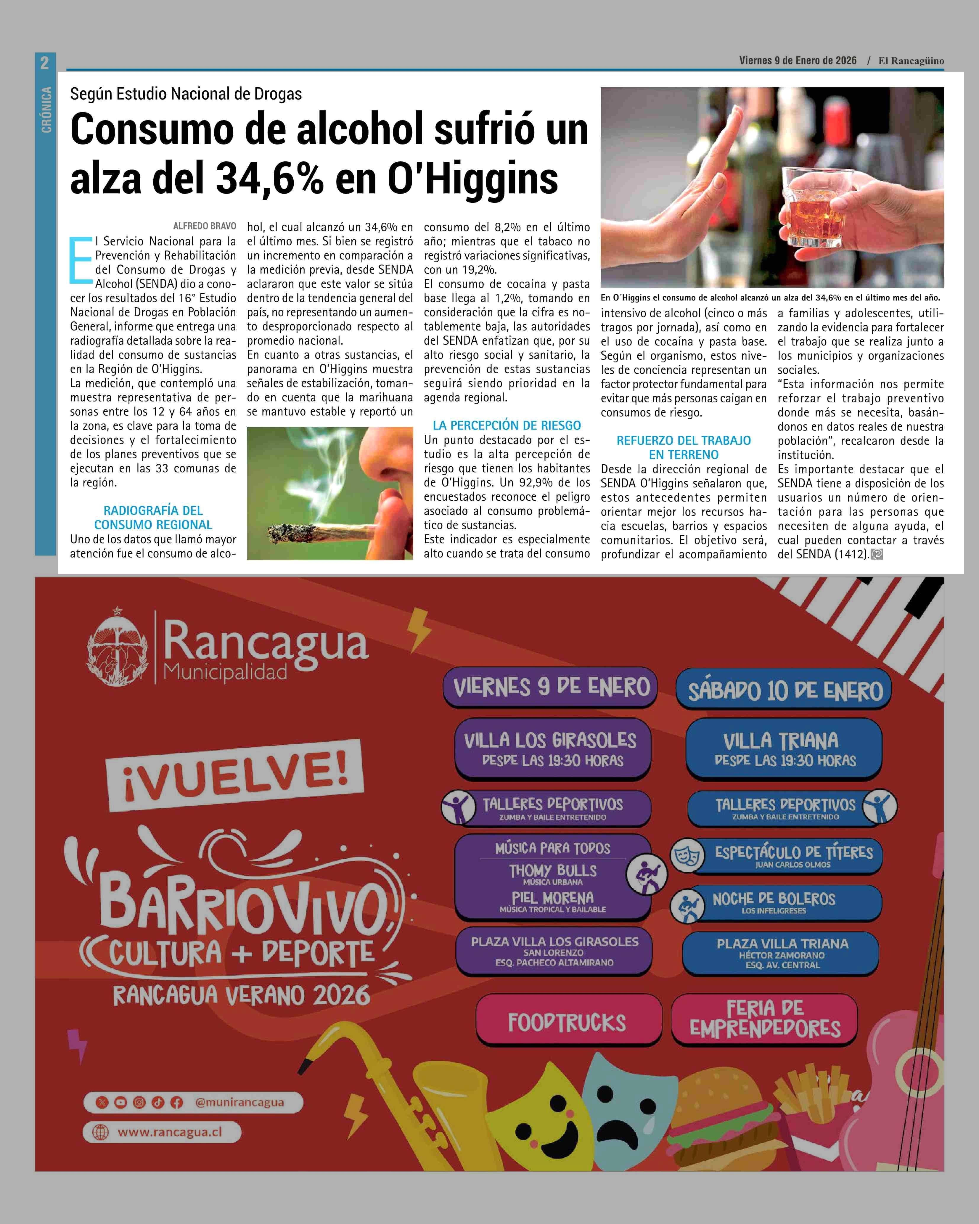 Consumo de alcohol sufrió un alza del 34,6% en O'Higgins 09-01-2026 El Rancagüino |