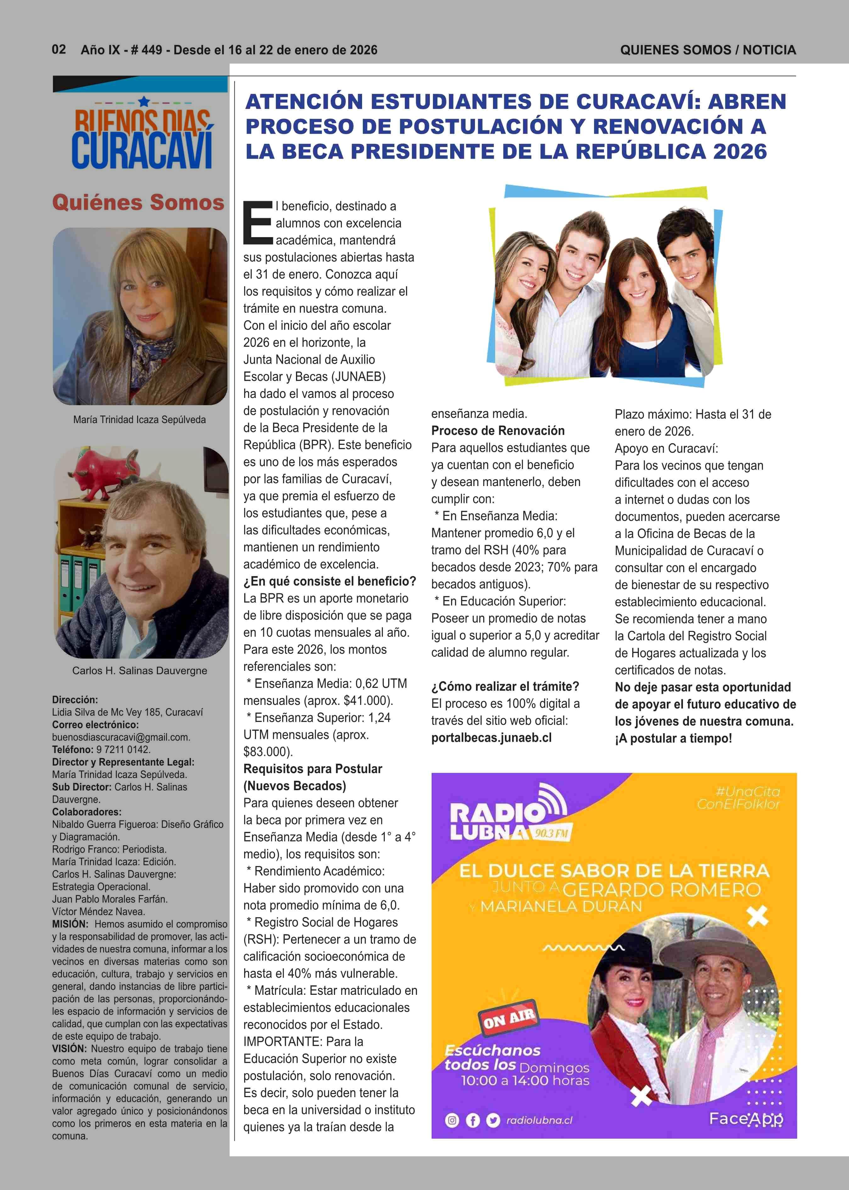 ATENCIÓN ESTUDIANTES DE CURACAVÍ: ABREN PROCESO DE POSTULACIÓN Y RENOVACIÓN A LA BECA PRESIDENTE DE LA REPÚBLICA 2026 16-01-2026 Buenos Días Curacaví |