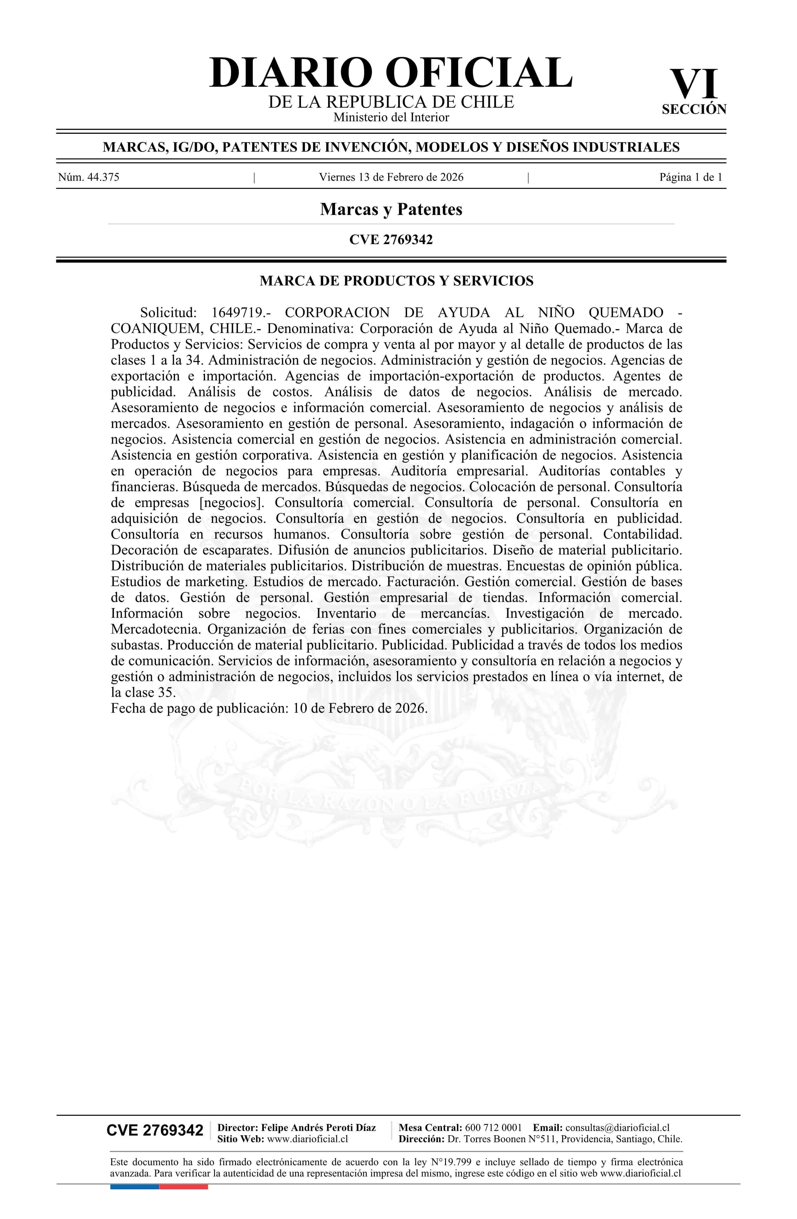Solicitud número 1649719.- Corporación de Ayuda al Niño Quemado 13-02-2026 Diario Oficial Edición Electrónica |