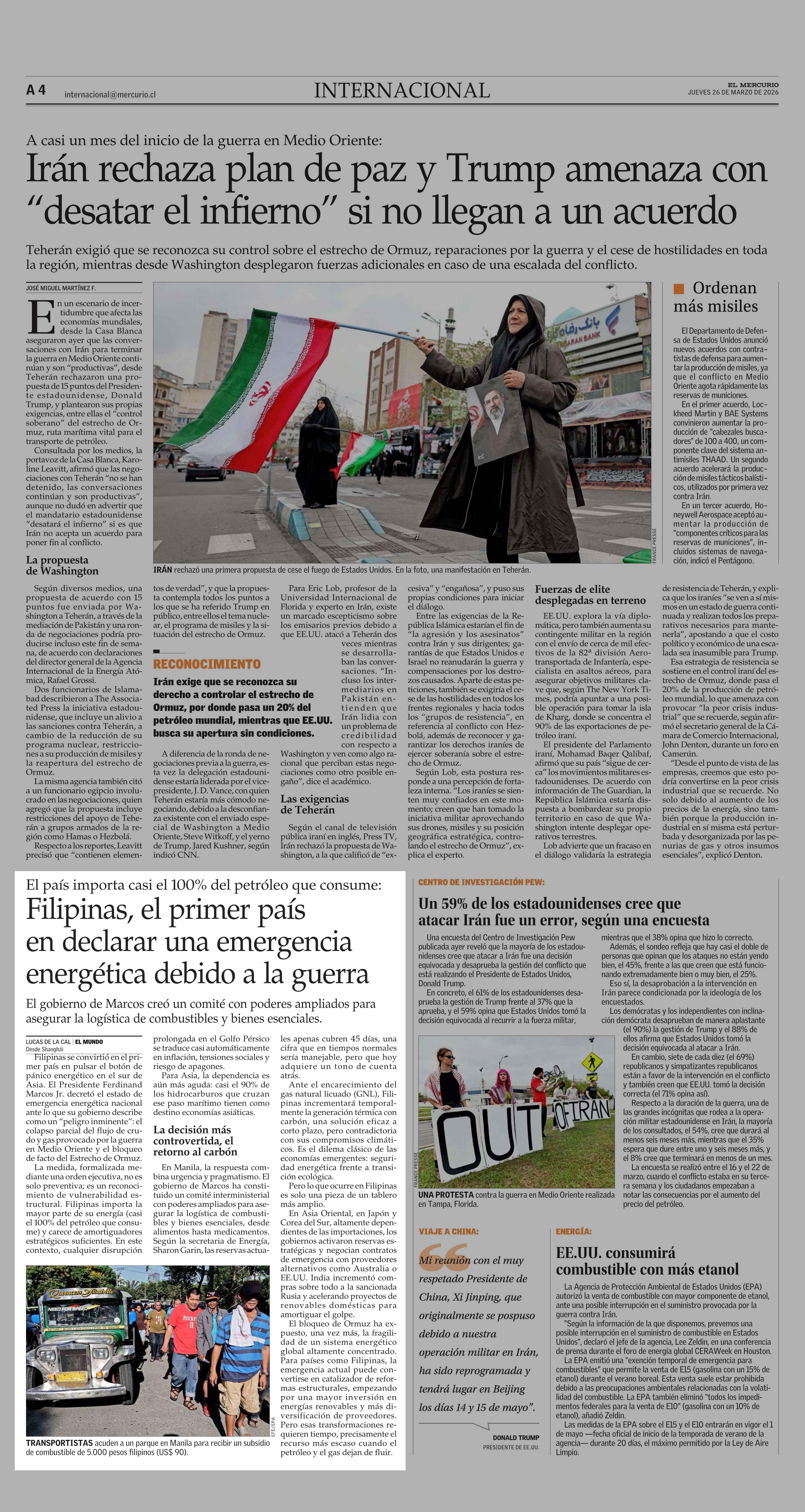 Filipinas, el primer país en declarar una emergencia energética debido a la guerra 26-03-2026 El Mercurio |