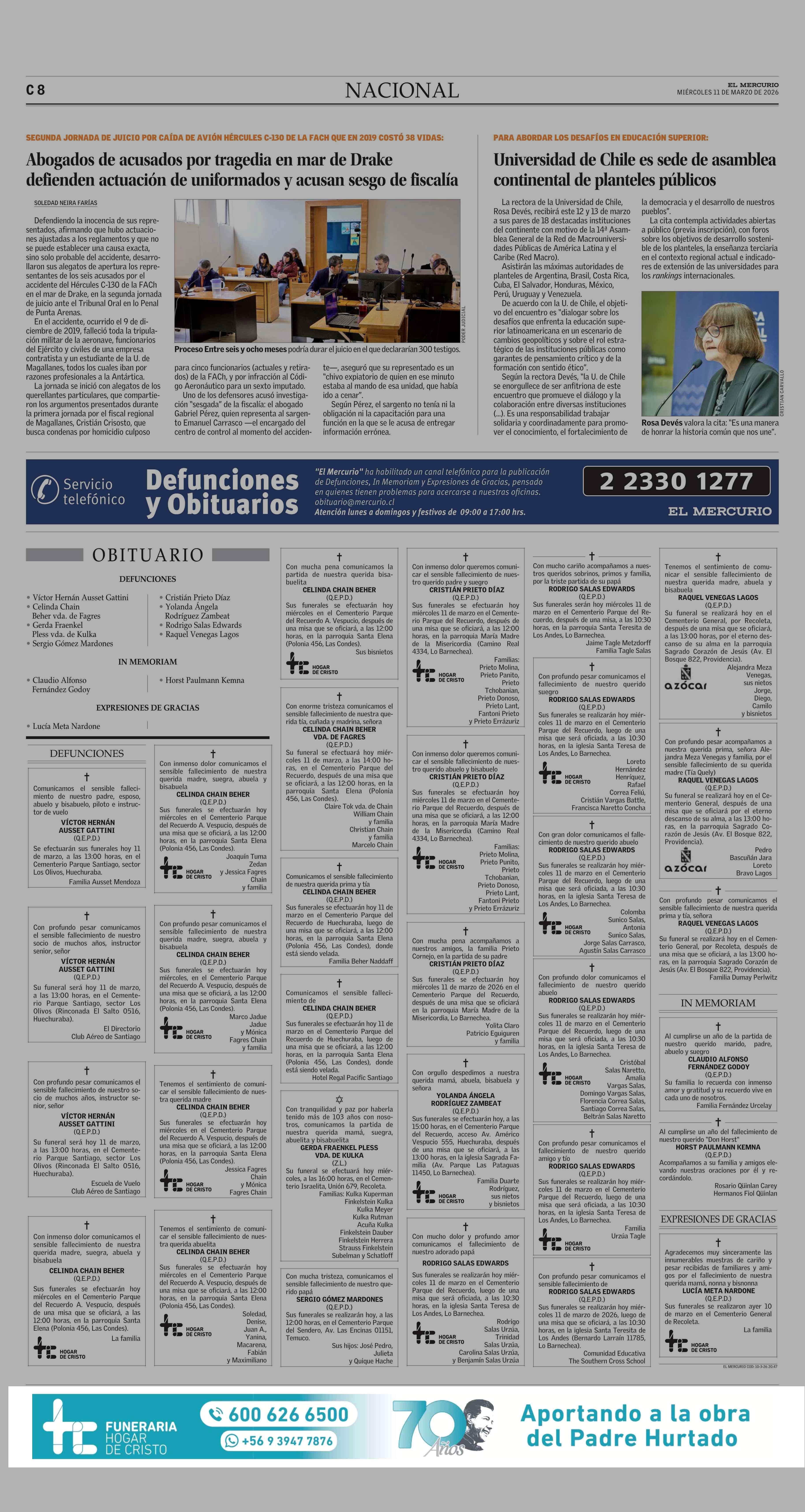 AVISO AYUDA SOCIAL: FUNERARIA HOGAR DE CRISTO 11-03-2026 El Mercurio |