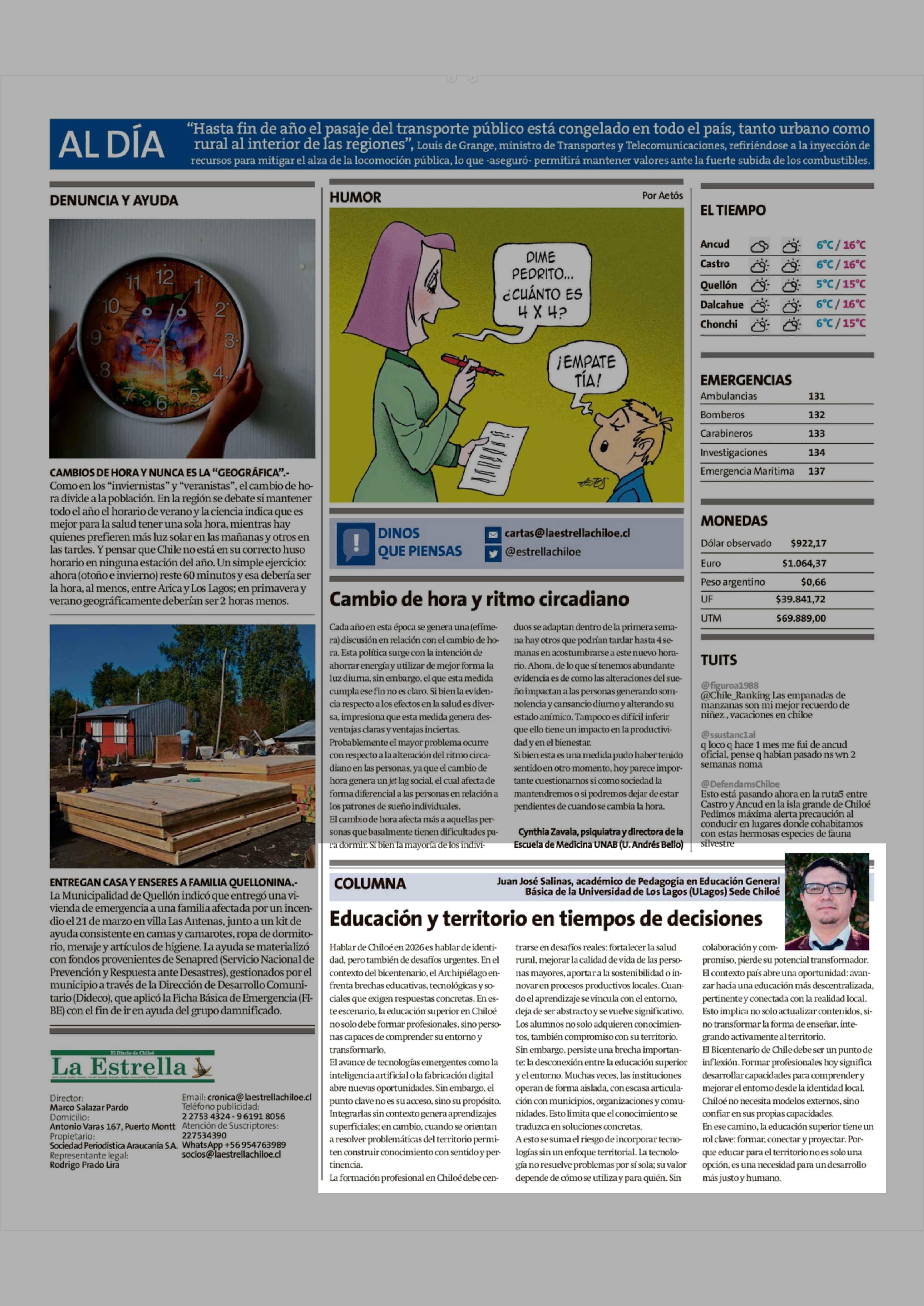 Columnas de Opinión: Educación y territorio en tiempos de decisiones 06-04-2026 La Estrella de Chiloé |