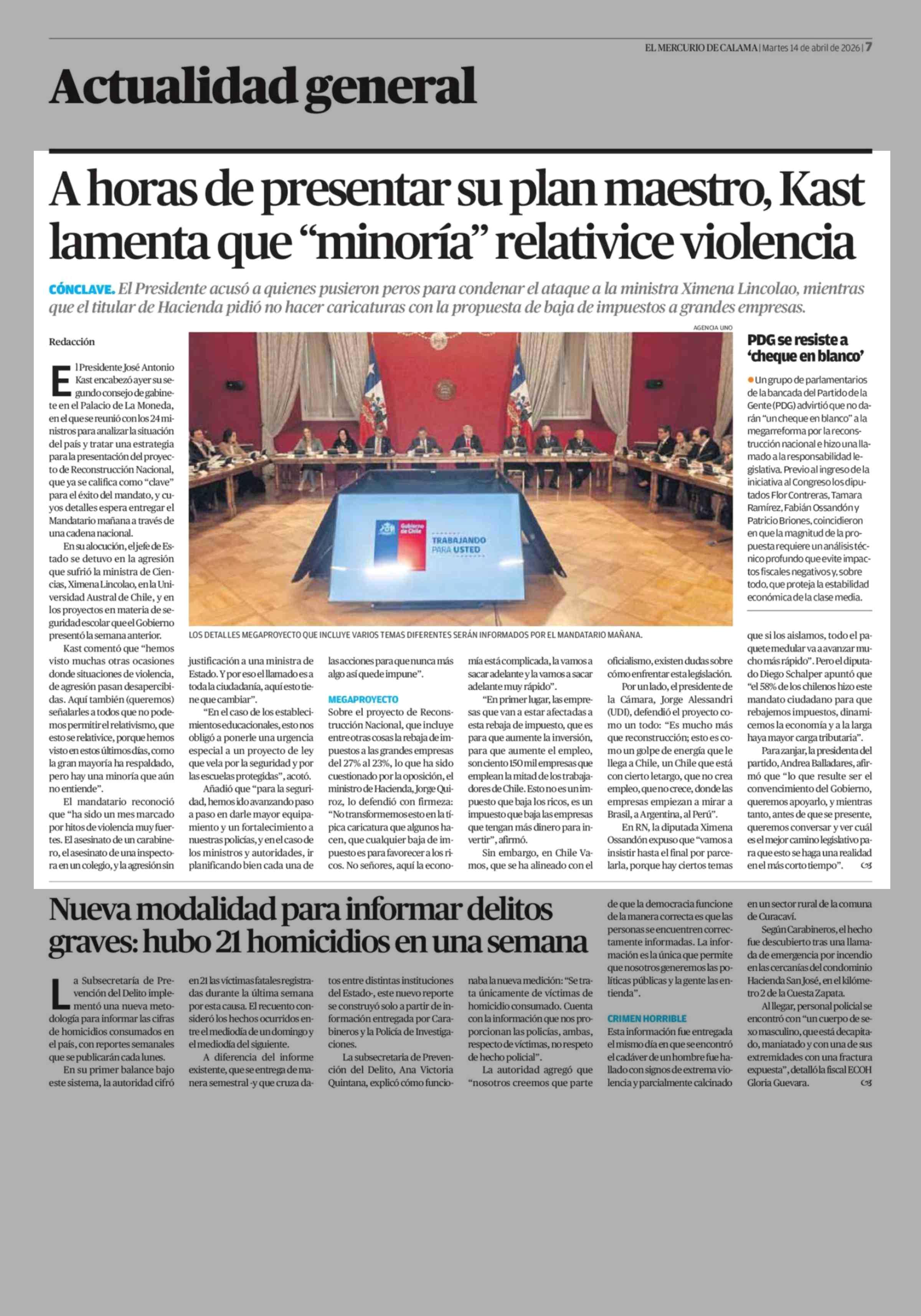 A horas de presentar su plan maestro, Kast lamenta que "minoría" relativice violencia 14-04-2026 El Mercurio de Calama |